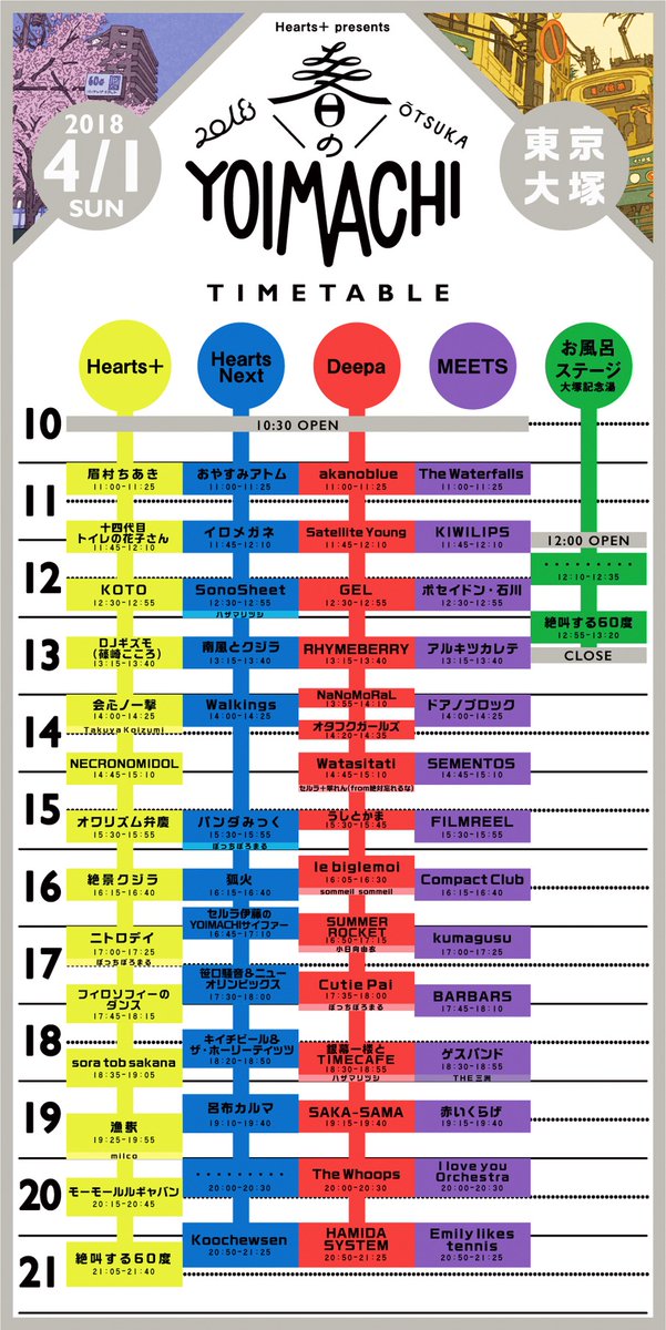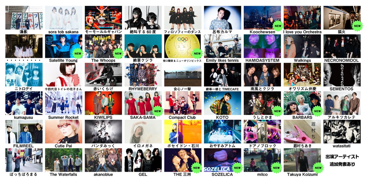 - 【第一弾アーティスト】漁港、sora tob sakana、モーモールルギャバン、絶叫する60度、呂布カルマ、I love you Orchestra、・・・・・・・・・、絶景クジラ、十四代目トイレの花子さん、銀幕一楼とTIMECAFE、NECRONOMIDOL、オワリズム弁慶、Summer Rocket、パンダみっく、ドアノブロック【第2弾出演アーティスト】フィロソフィーのダンス、Emily likes tennis、ニトロデイ、南風とクジラ、KOTO、Compact Club、イロメガネ、眉村ちあき 【第3弾出演アーティスト 】 HAMIDASYSTEM、RHYMEBERRY、Walkings、赤いくらげ、会心ノ一撃、SEMENTOS、kumagusu、KIWILIPS、アルキツカレテ、おやすみアトム、FILMREEL、Cutie Pai、ポセイドン石川、watasitati、ぼっちぼろまる、The Waterfalls、akanoblue、GEL 【第4弾出演アーティスト 】 Koochewsen、狐火、Satellite Young、The Whoops、笹口騒音&ニューオリンピックス、SAKA-SAMA、うしとかま、BARBARS、THE三洲、SOZELICA、milco、Takuya Koizumi 【第5弾出演アーティスト】ゲスバンド、セルラ伊藤のYOIMACHIサイファー(セルラ伊藤、簾ンデゲオチェロ(Urban Drive Family)、他)、SonoSheet、NaNoMoRaL、セルラ伊藤+貫地谷翠れん(from 絶対忘れるな)(1曲入魂アクト)、ハザマリツシ、オタフクガールズ、le biglemoi、sommeil sommeil(1曲入魂アクト)、FOOD : Boulangerie BASSE 【第6弾出演アーティスト】キイチビール&ザ・ホーリーティッツ、DJギズモ(篠崎こころ) 他 ※50組以上出演予定