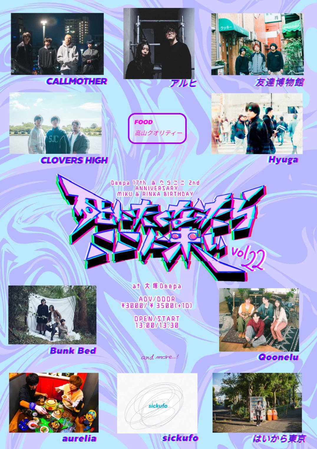 大塚 Deepa スケジュール 2025.11.16(Sun) 死にたくなったらここに来い vol.22 [ACT] CALLMOTHER / aurelia / アルヒ / sickufo / Qoonelu / はいから東京 / CLOVER HIGH / Bunk Bed / 友達博物館 / Hyuga and more... food:高山クオリティー [OPEN/START] 13:00/13:30 [料金] ADV/DOOR ¥3000/¥3500(+1D)