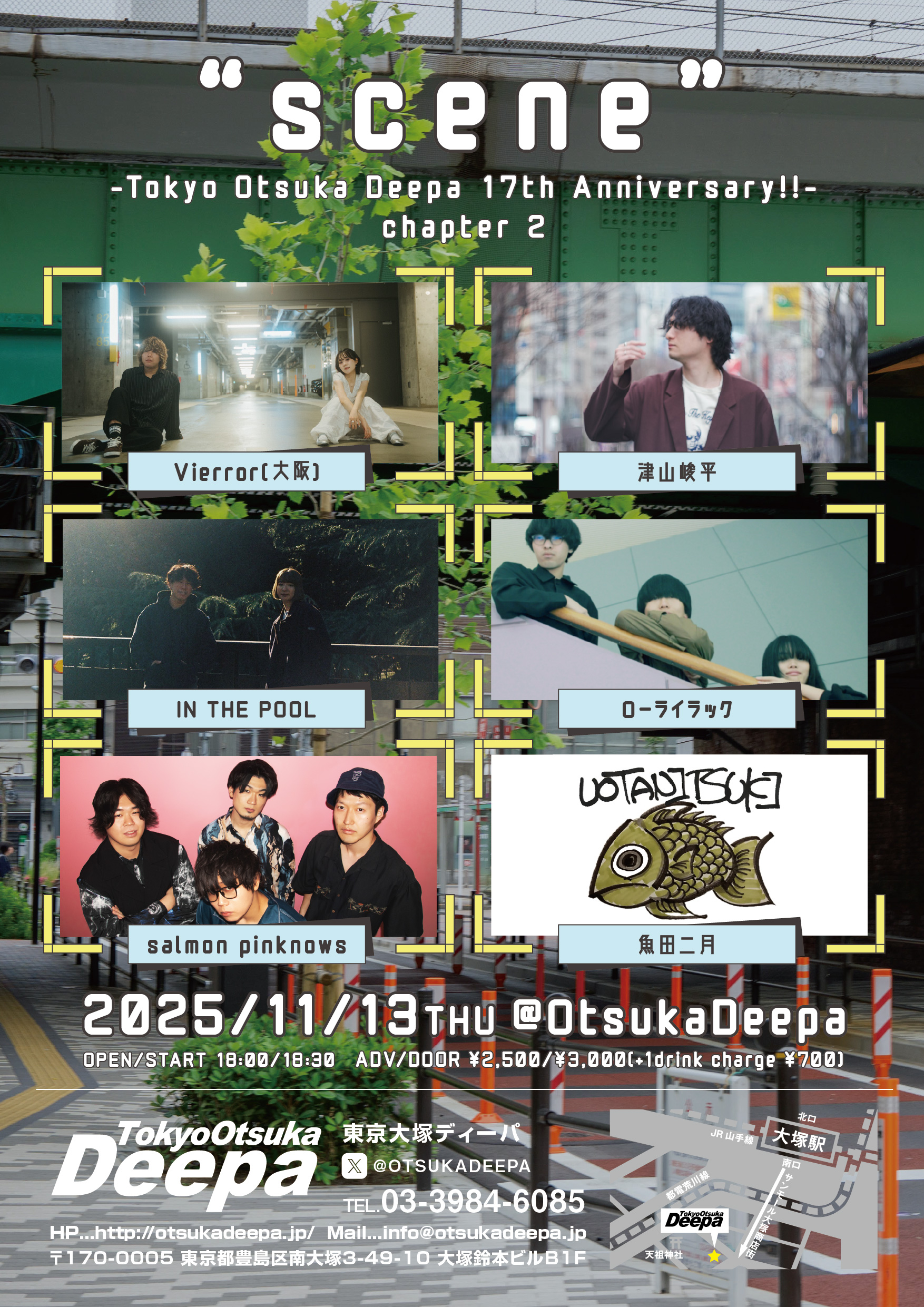 大塚 Deepa スケジュール 2025.11.13(Thu) ”scene”~Tokyo Otsuka Deepa 17th Anniversary!!~chapter2 [ACT] Vierror(大阪) / 津山峻平 / IN THE POOL / ローライラック / salmon pinknows / 魚田二月 [OPEN/START] 18:00/18:30 [料金] ADV/DOOR ¥2,500/¥3,000 (各別1D)