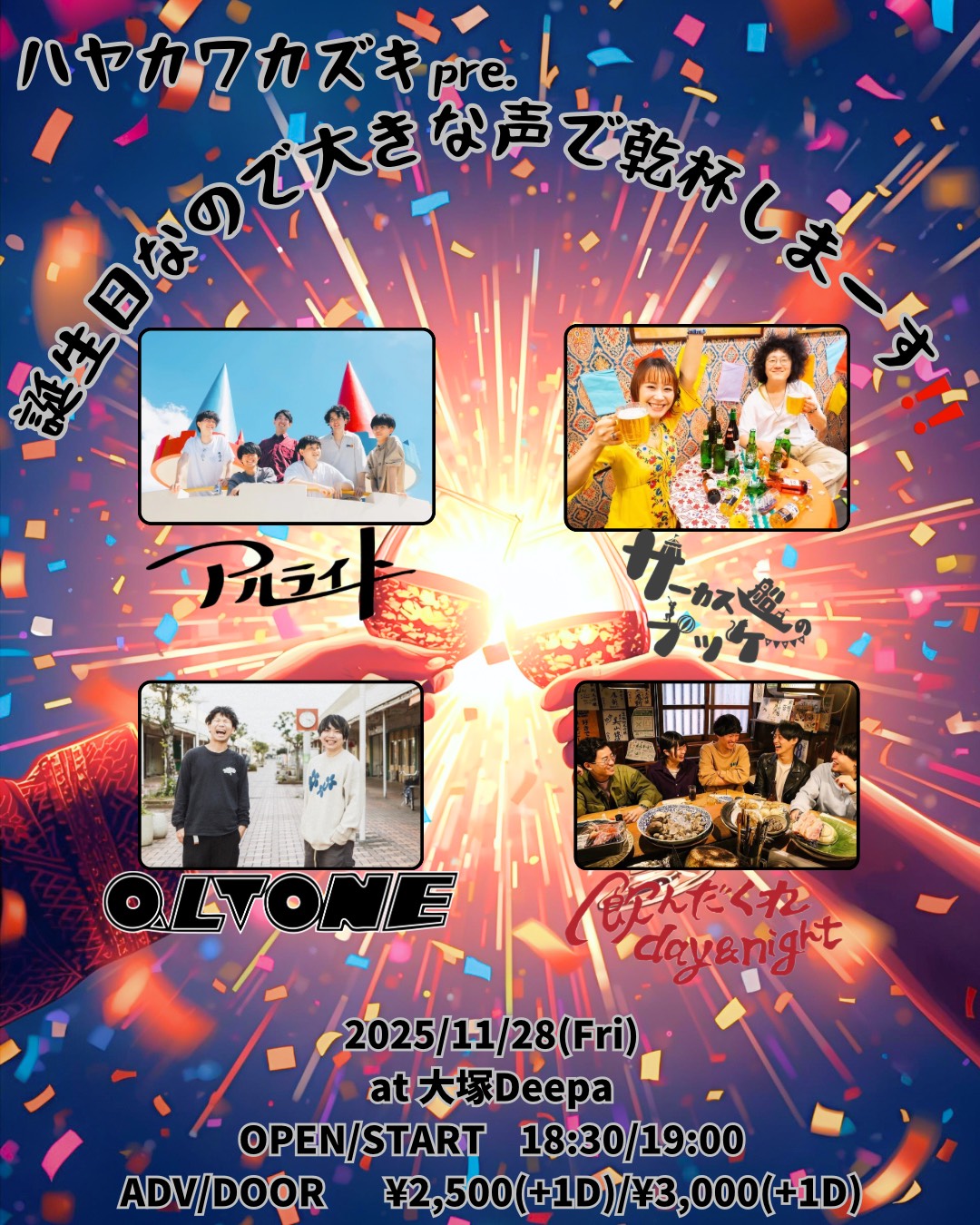 大塚 Deepa スケジュール 2025.11.28(Fri) ハヤカワカズキpre. 誕生日なので大きな声で乾杯しまーす‼️ [ACT] QLTONE / アルライト / サーカス船のプッケ / 飲んだくれday&night [OPEN/START] 18:30/19:00 [料金] ADV/DOOR ¥2,500/¥3,000 (各別1D)