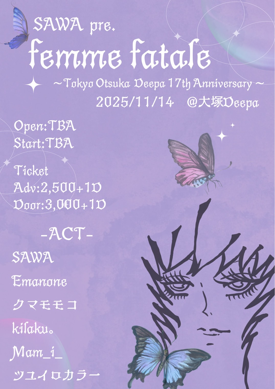 大塚 Deepa スケジュール 2025.11.14(Fri) SAWApre. "femme fatale" Tokyo Otsuka Deepa 17th Anniversary!! [ACT] SAWA / Emanone / クマモモコ / kilaku。 / Mam_i_ / ツユイロカラー [OPEN/START] TBA/TBA [料金] ADV/DOOR ¥2,500/¥3,000 (各別1D)