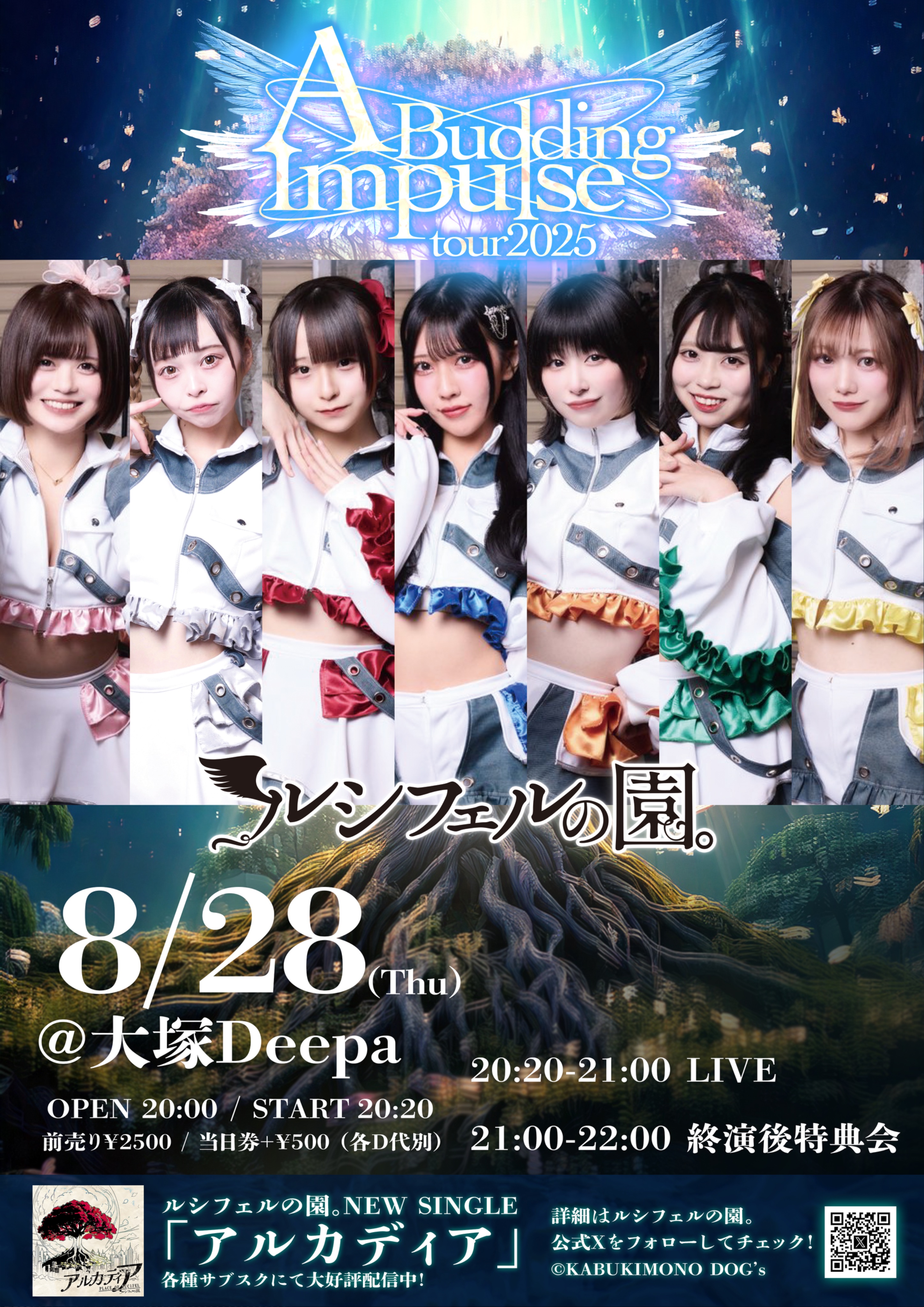 大塚 Deepa スケジュール 2025.8.28(Thu) A Budding impulse~tour2025~ [ACT] ルシフェルの園。 [OPEN/START] 20:00/20:20 [料金] 予約¥2500(1D代別)/当日¥3000(1D代別) https://tiget.net/events/424909