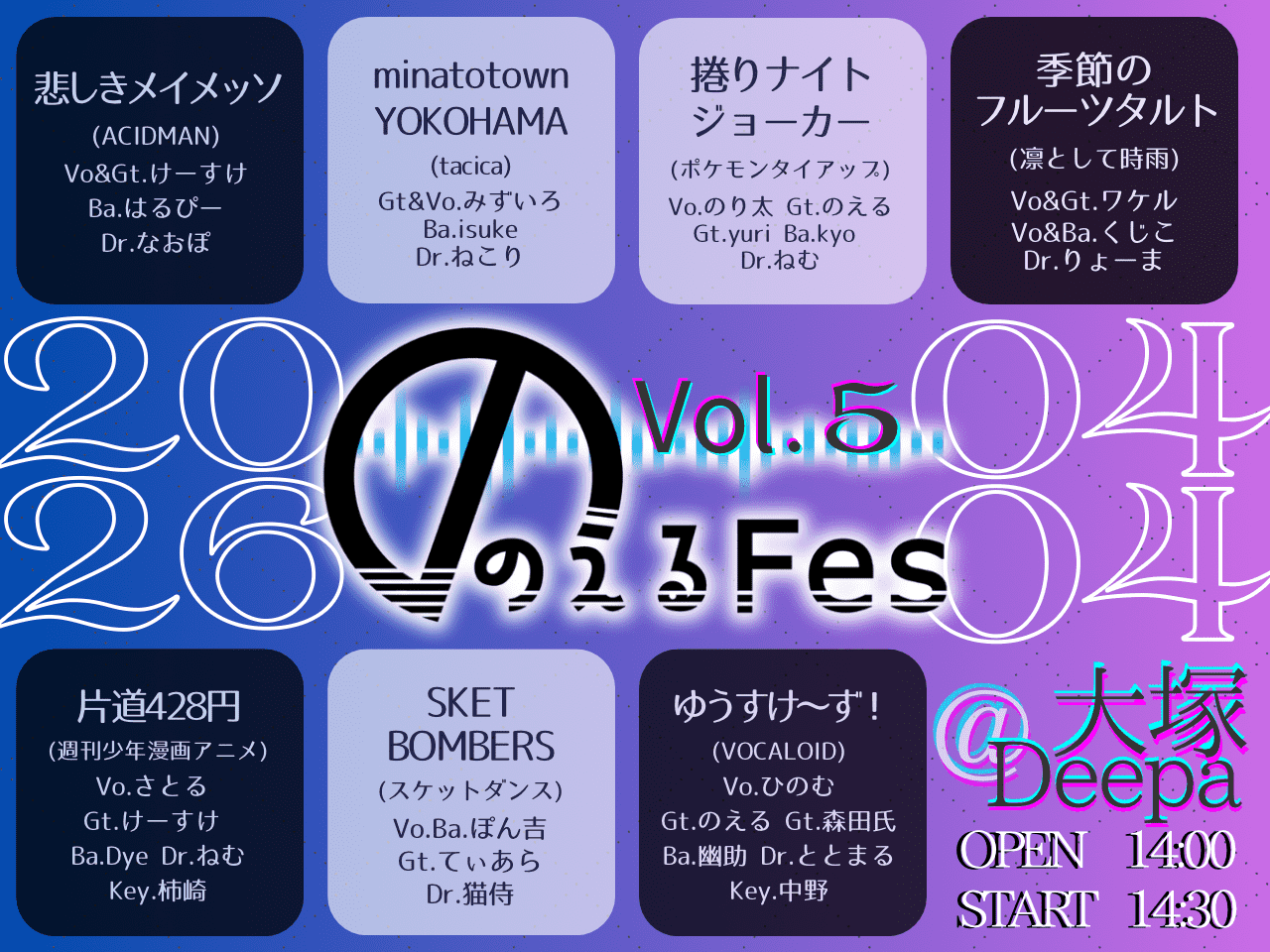 - 悲しきメイメッソ(ACIDMAN) Vo&Gt.けーすけ Ba.はるぴー Dr.なおぽ minatotown YOKOHAMA(tacica) Gt&Vo.みずいろ Ba.isuke Dr.ねこり 捲りナイトジョーカー(ポケモンタイアップ) Vo.のり太 Gt.のえる Gt.yuri Ba.kyo Dr.ねむ 季節のフルーツタルト(凛として時雨) Vo&Gt.ワケル Vo.&Ba.くじこ Dr.りょーま 片道428円(週刊少年漫画アニメOP,ED曲) Vo.さとる Gt.けーすけ Ba.Dye Dr.ねむ Key.柿崎 SKET BOMBERS(スケットダンス) Vo.Ba.ぽん吉 Gt.てぃあら Dr.猫侍 ゆうすけ~ず!(VOCALOID) Vo.ひのむ Gt.のえる Gt.森田氏 Ba.幽助 Dr.ととまる Key.中野