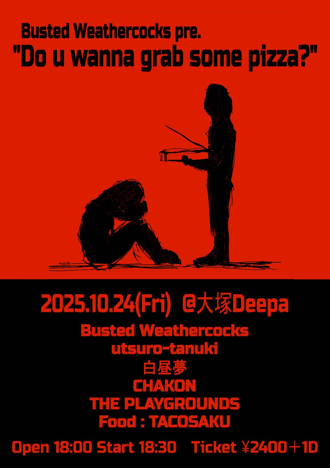 大塚 Deepa スケジュール 2025.10.24(Fri) Busted Weathercocks pre. "Do u wanna grab some pizza?" [ACT] Busted Weathercocks / utsuro-tanuki / 白昼夢 / CHAKON / THE PLAYGROUNDS <FOOD>TACOSAKU [OPEN/START] 18:00/18:30 [料金] ¥2,400-(1drink charge¥700-別途)