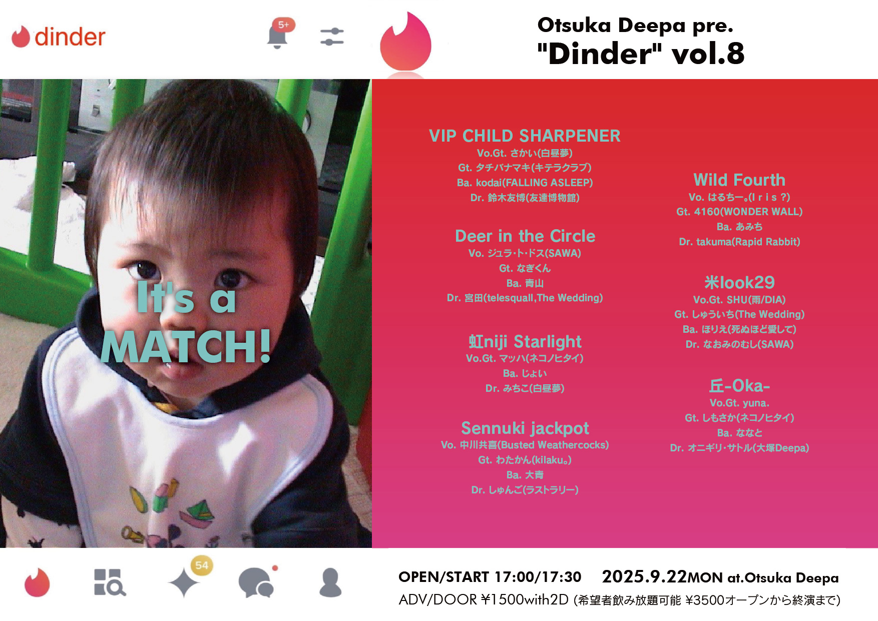 大塚 Deepa スケジュール 2025.9.22(Mon) Otsuka Deepa pre. "Dinder" vol.8 [ACT] フライヤーをご参照ください。 [OPEN/START] 17:00/17:30 [料金] ADV/DOOR ¥1500with2D (希望者飲み放題可能 ¥3500オープンから終演まで)
