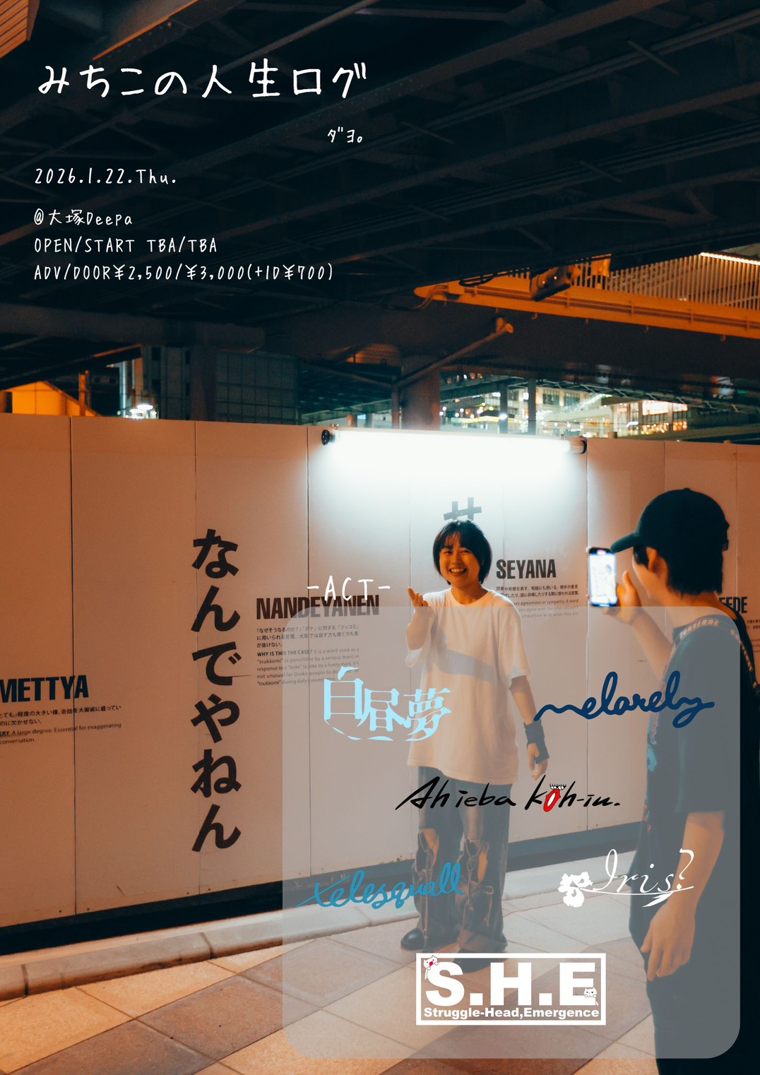 大塚 Deepa スケジュール 2026.1.22(Thu) 「みちこの人生ログ」 [ACT] 白昼夢 / melarely / I r i s ? / Ah ieba köh-iu. / S.H.E / telesquall [OPEN/START] TBA/TBA [料金] ADV/DOOR ¥2,500/¥3,000 (各別1D)