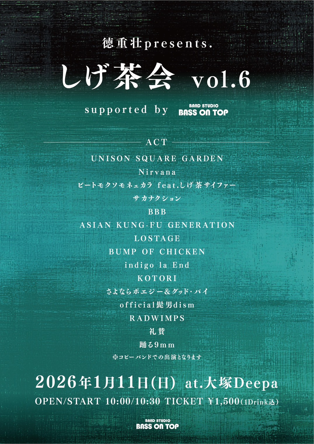 大塚 Deepa スケジュール 2026.1.11(Sun) 徳重壮 presents. しげ茶会 vol.6 -supported by BASS ON TOP- [ACT] ACT:フライヤーをご参照ください [OPEN/START] 10:00/10:30 [料金] ADV/DOOR ¥800/¥800(+1D)