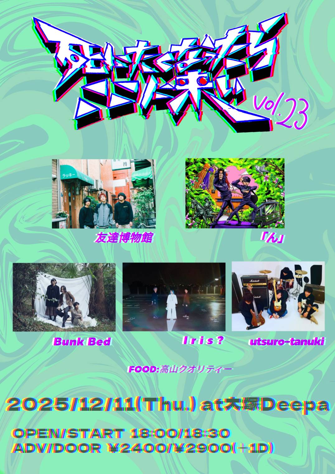 大塚 Deepa スケジュール 2025.12.11(Thu) 死にたくなったらここに来いvol.23 [ACT] I r i s ? / utsuro-tanuki / 友達博物館 / Bunk Bed /「ん」 [OPEN/START] 18:00/18:30 [料金] ADV/DOOR ¥2,400/¥2,900 (各別1D)