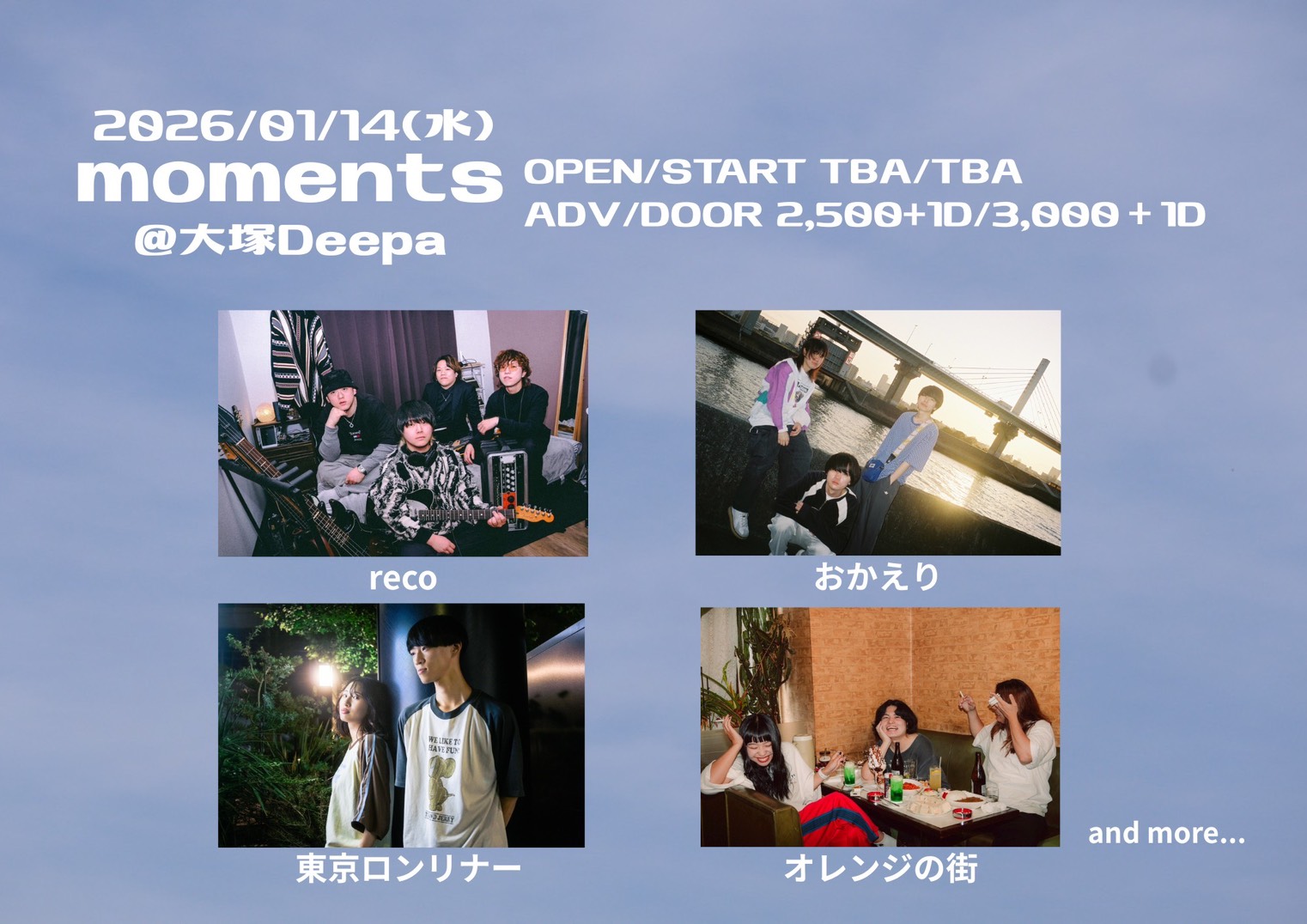 大塚 Deepa スケジュール 2026.1.14(Wed) moments 3週連続企画 [ACT] おかえり / オレンジの街 / reco / 東京ロンリナー [OPEN/START] TBA/TBA [料金] ADV/DOOR ¥2,500/¥3,000 (各別1D)