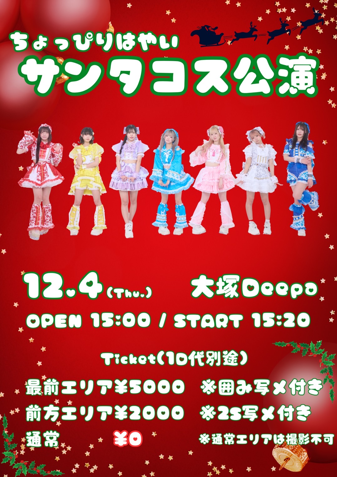 大塚 Deepa スケジュール 2025.12.04(Thu) 笑う門には福来たる ~ちょっぴりはやいサンタコス公演~ [ACT] 笑う門には福来たる [OPEN/START] 15:00/15:20 [料金] 料金:最前エリア5000円 前方エリア2000円 通常エリア0円 / 当日券各+500円 (入場時1ドリンク必須)