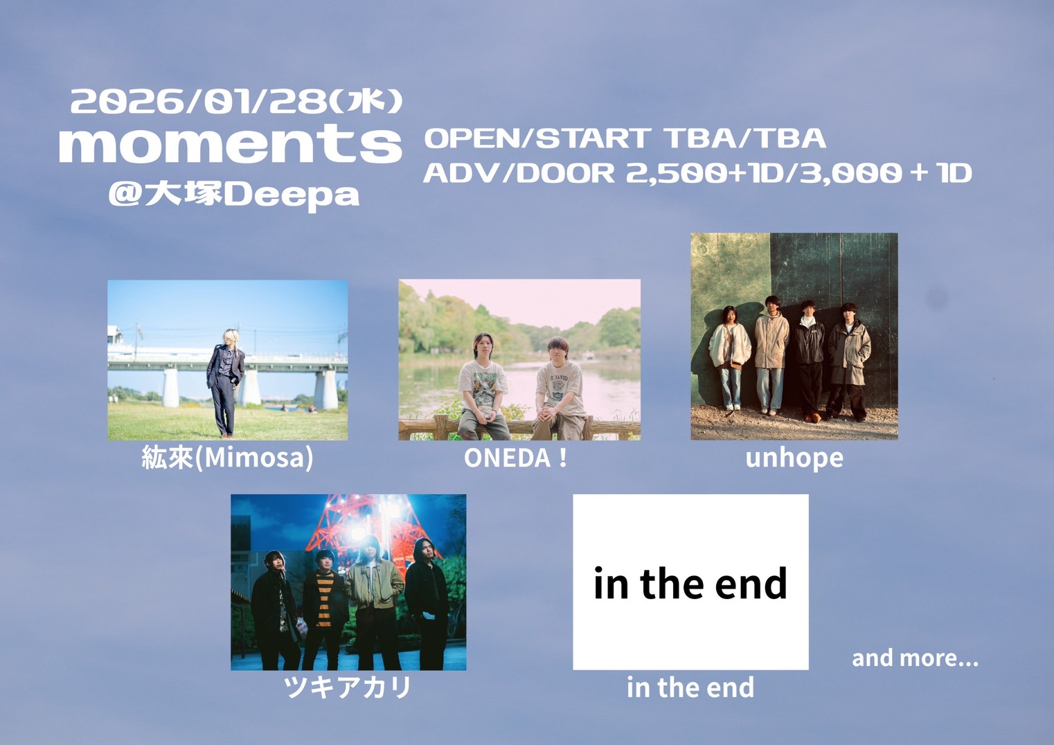 大塚 Deepa スケジュール 2026.1.28(Wed) moments 3週連続企画 [ACT] ONEDA! / 紘來(Mimosa) / ツキアカリ / in the end / unhope and more… [OPEN/START] TBA/TBA [料金] ADV/DOOR ¥2,500/¥3,000 (各別1D)