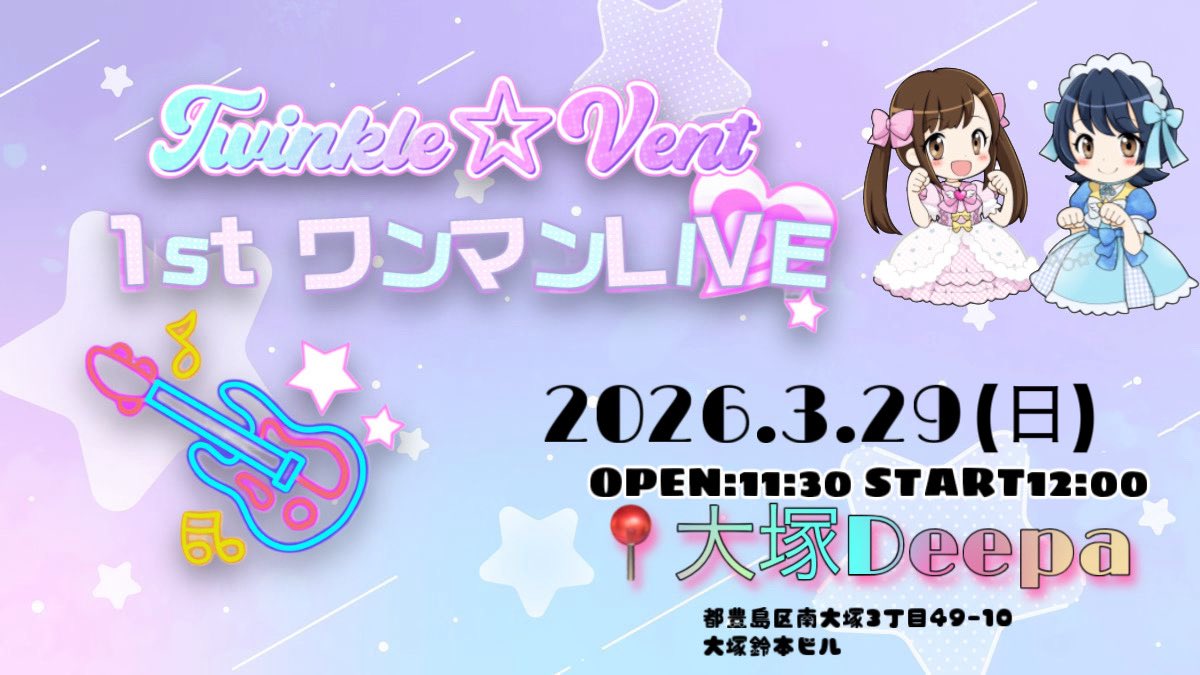大塚 Deepa スケジュール 2026.3.29(Sun) Twinkle☆Vent 1stワンマンライブ [ACT] Twinkle☆Vent [OPEN/START] 11:30/12:00 [料金] 数量限定レアチケット(予約・先着3枚)? ¥13,000 最前予約チケット? ¥10,000 一般予約チケット ¥5,000