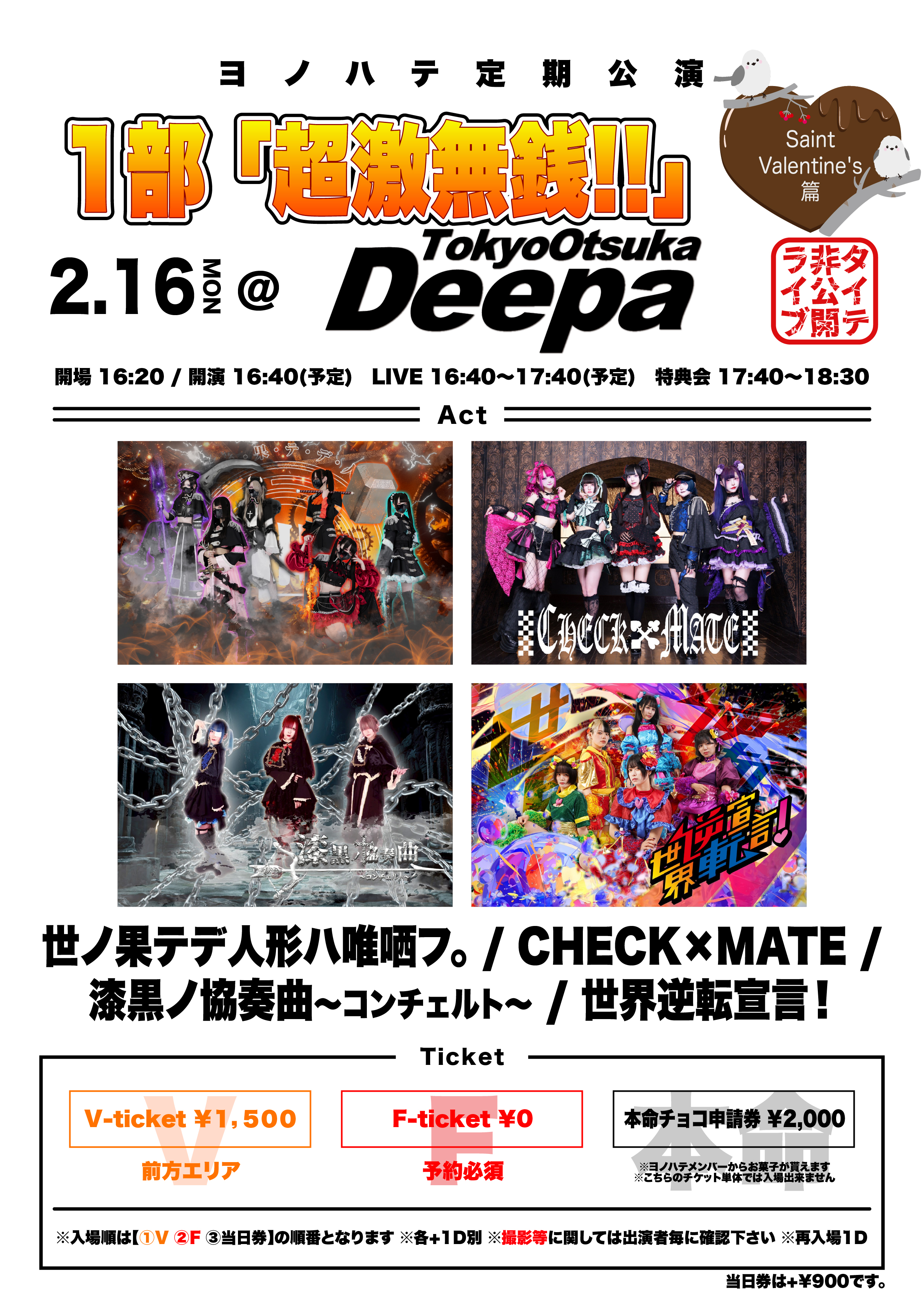 - Vチケット1,500円 Fチケット0円(要予約) 販売〆切2月16日15:20 当日+900円/各チケット+1D別