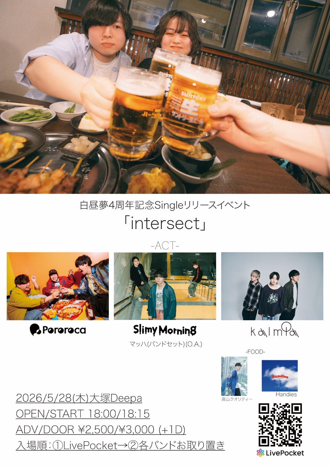 大塚 Deepa スケジュール 2026.5.28(Thu) 白昼夢4周年記念Singleリリースイベント 「intersect」 [ACT] -act- 白昼夢/Pororoca/Slimy Morning/kalmia -FOOD- 高山クオリティ [OPEN/START] 18:30/19:00 [料金] ADV/DOOR ¥2,500/¥3,000 (各別1D) https://livepocket.jp/e/2o4yu