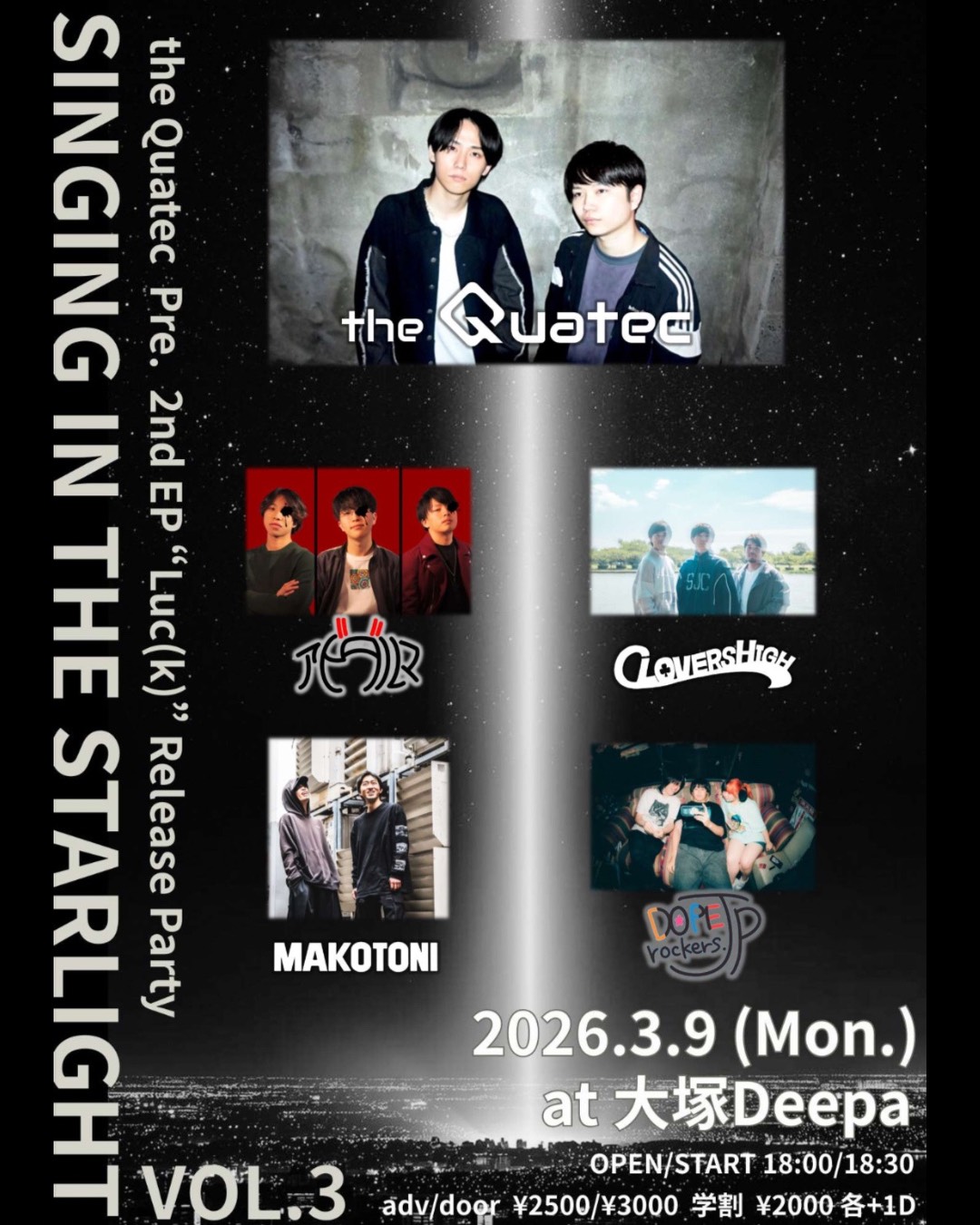 大塚 Deepa スケジュール 2026.3.09(Mon) the Quatec pre. 2nd EP 『Luc(k)』 Release Party “SINGING IN THE STARLIGHT VOL.3” [ACT] the Quatec CLOVERS HIGH アビダルマ MAKOTONI DOPErockers.JP [OPEN/START] 18:00/18:30 [料金] Adv./Door. ¥2,500/¥3,000 学割 ¥2,000 (各+1D ¥700)