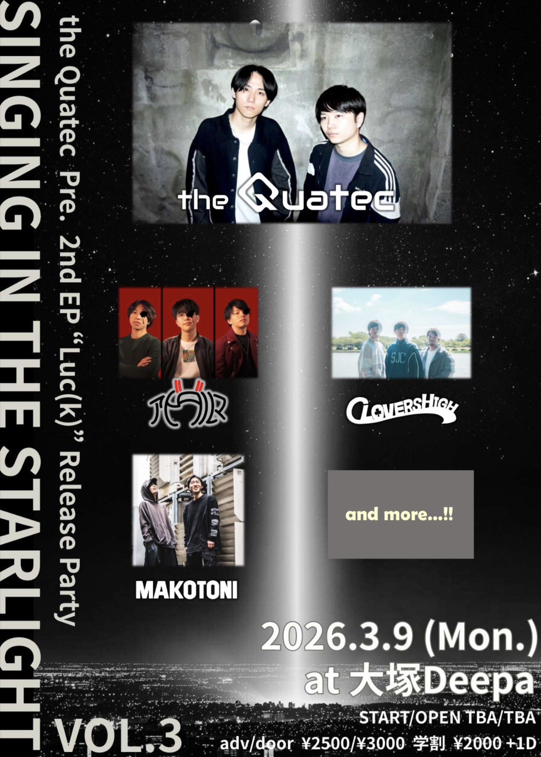 大塚 Deepa スケジュール 2026.3.09(Mon) the Quatec pre. 2nd EP 『Luc(k)』 Release Party “SINGING IN THE STARLIGHT VOL.3” [ACT] the Quatec / CLOVERS HIGH / アビダルマ / MAKOTONI and more… [OPEN/START] TBA/TBA [料金] Adv./Door. ¥2,500/¥3,000 学割 ¥2,000 (各+1D ¥700)