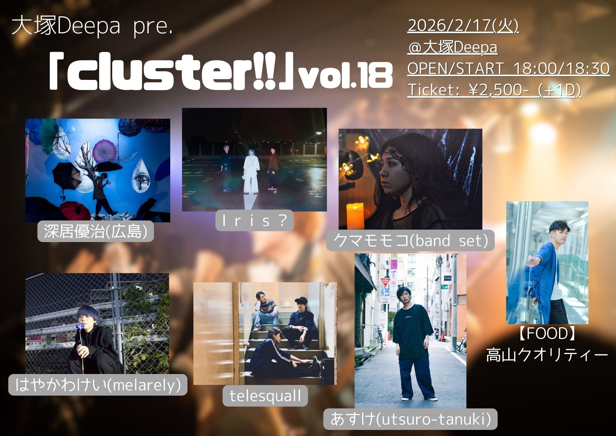 大塚 Deepa スケジュール 2026.2.17(Tue) 大塚Deepa pre.「cluster!!」vol.18 [ACT] 深居優治(広島)/I r i s ?/クマモモコ(band set)/はやかわけい(melarely)/telesquall/あすけ(utsuri-tanuki) [OPEN/START] 18:00/18:30 [料金] Ticket: ¥2,500-(+1D)