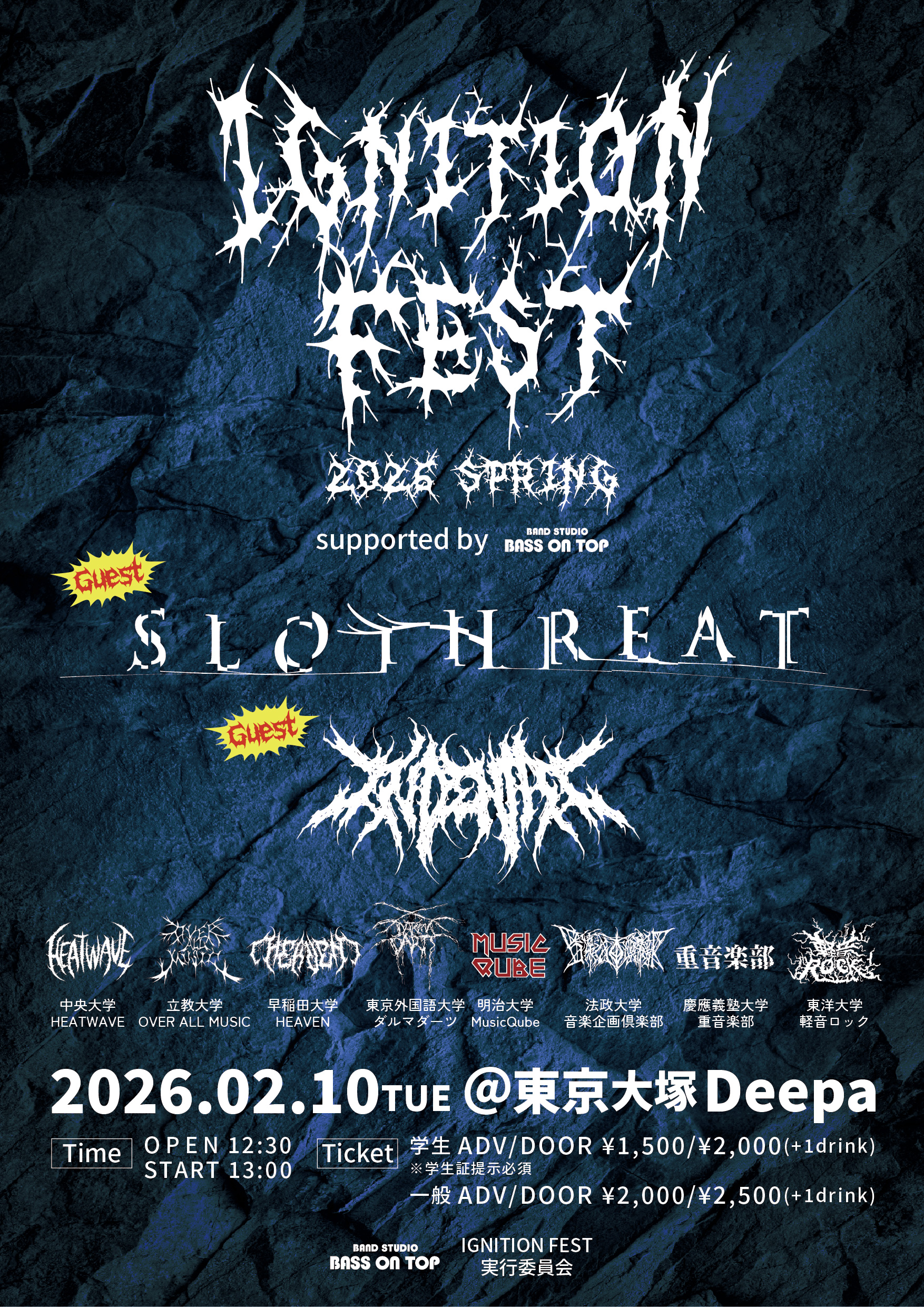 - GUEST ACT: SLOTHREAT/IN DENIAL ACT : 中央大学HEATWAVE / 立教大学OVER ALL MUSIC / 早稲田大学HEAVEN / 慶應義塾大学重音楽部 / 東京外国語大学ダルマダーツ / 法政大学音楽企画倶楽部 / 明治大学MusicQube / 東洋大学軽音ロック