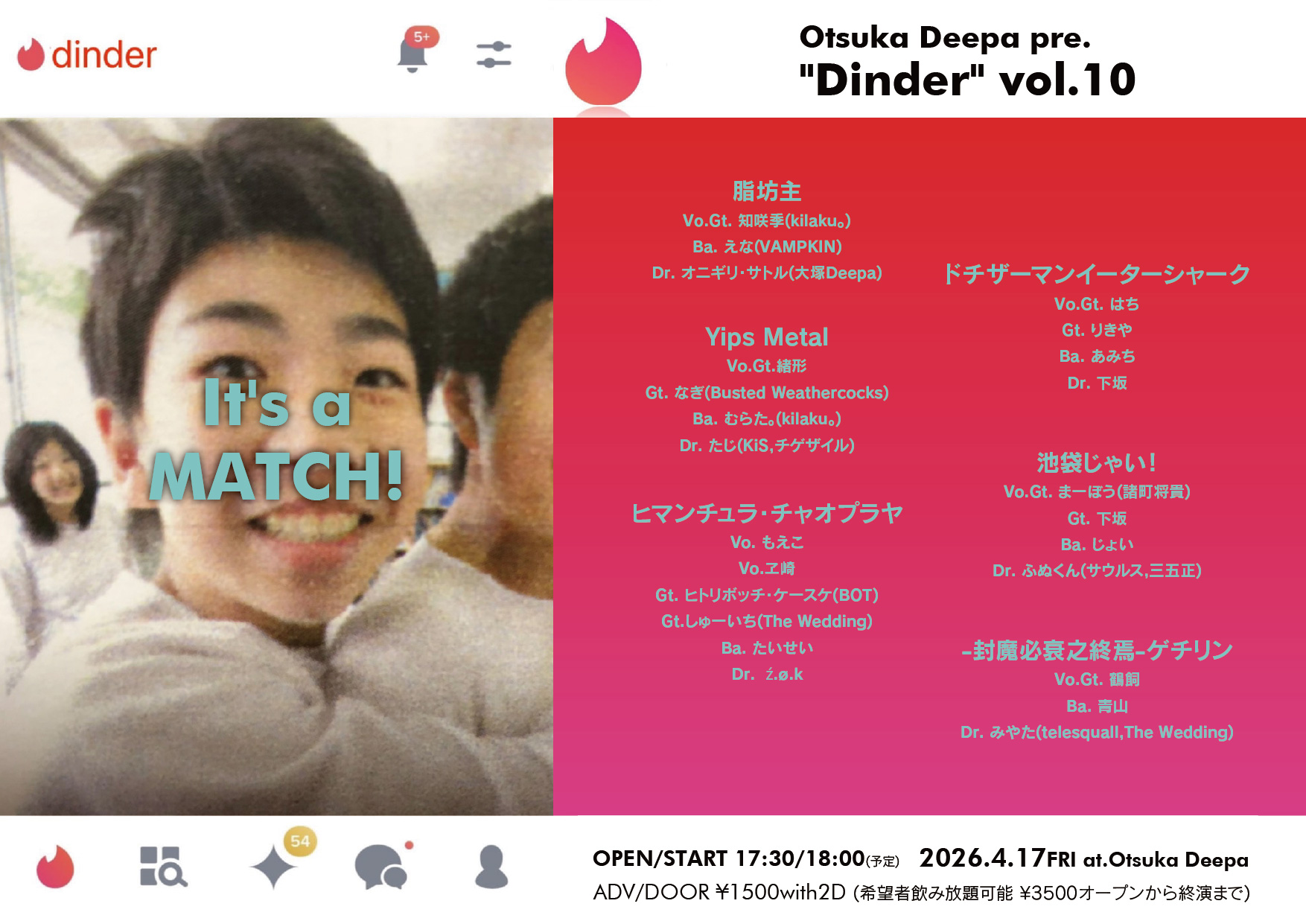- 〇脂坊主 Vo.Gt. 知咲季(kilaku。) Ba. えな(VAMPKIN) Dr. オニギリ・サトル(大塚Deepa) 〇ドチザーマンイーターシャーク Vo.Gt はち Gt. りきや Ba. あみち Dr. 下坂 〇Yips Metal Vo.Gt.緒形 Gt.なぎ(Busted Weathercocks) Ba. むらた。(kilaku。) Dr. たじ(KiS,チゲザイル) 〇池袋じゃい! Vo.Gt まーぼう(諸町将貴) Gt. 下坂 Ba. じょい Dr. ふぬくん(サウルス,三五正) 〇ヒマンチュラ・チャオプラヤ Vo. もえこ Vo.ヱ崎 Gt. ヒトリボッチ・ケースケ(BOT) Gt.しゅーいち(The Wedding) Ba. たいせい Dr. ź.ø.k 〇-封魔必衰之終焉-ゲチリン Vo.Gt. 鶴飼 Ba. 青山 Dr. みやた(telesquall,The Wedding)
