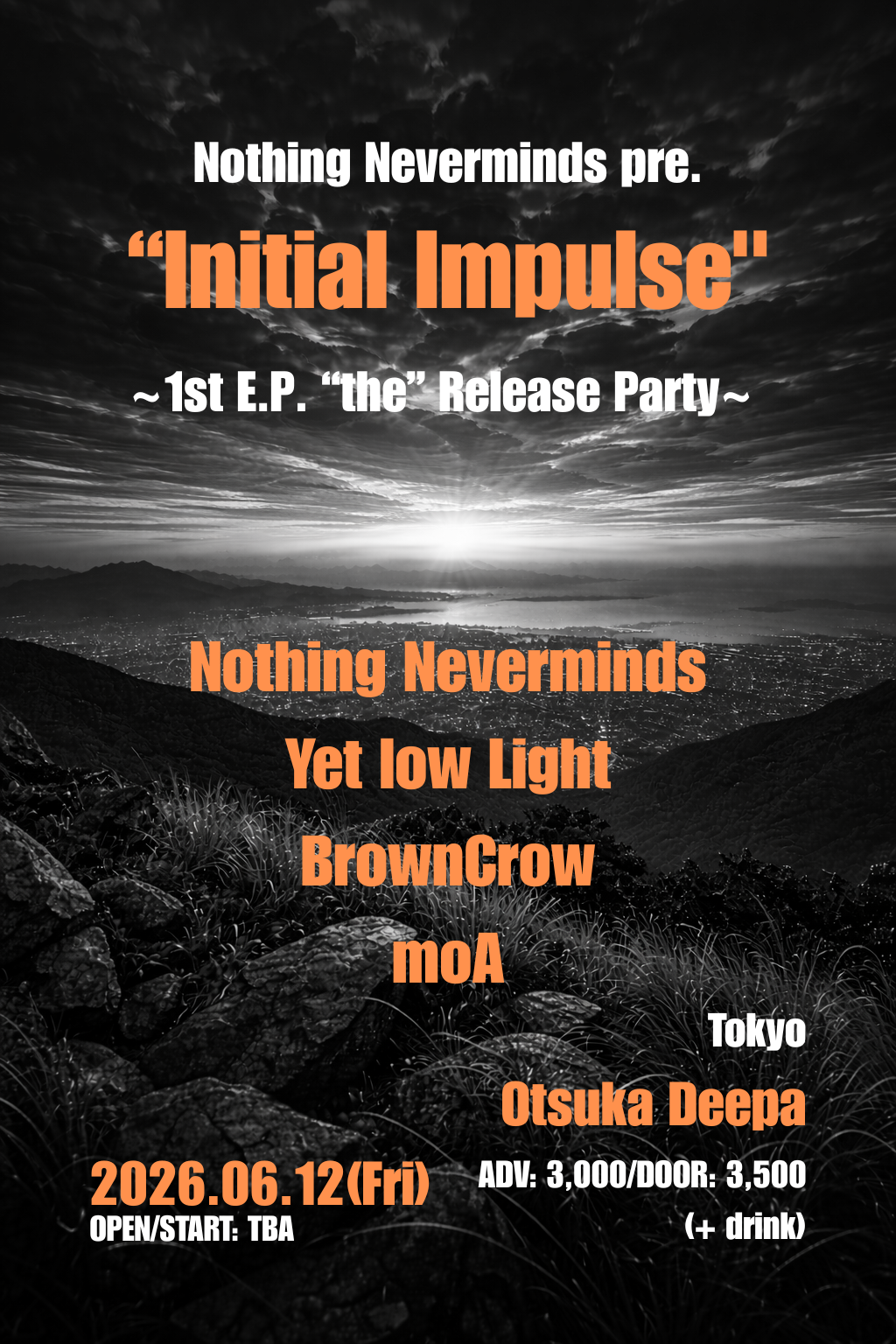 大塚 Deepa スケジュール 2026.6.12(Fri) Nothing Neverminds pre. "Initial Impulse"~1st E.P"the" Release Party~ [ACT] <ACT> Nothing Neverminds / Yet low Light / BrownCrow / moA [OPEN/START] TBA/TBA [料金] ADV/DOOR ¥3,000/¥3,500 (各別1D)