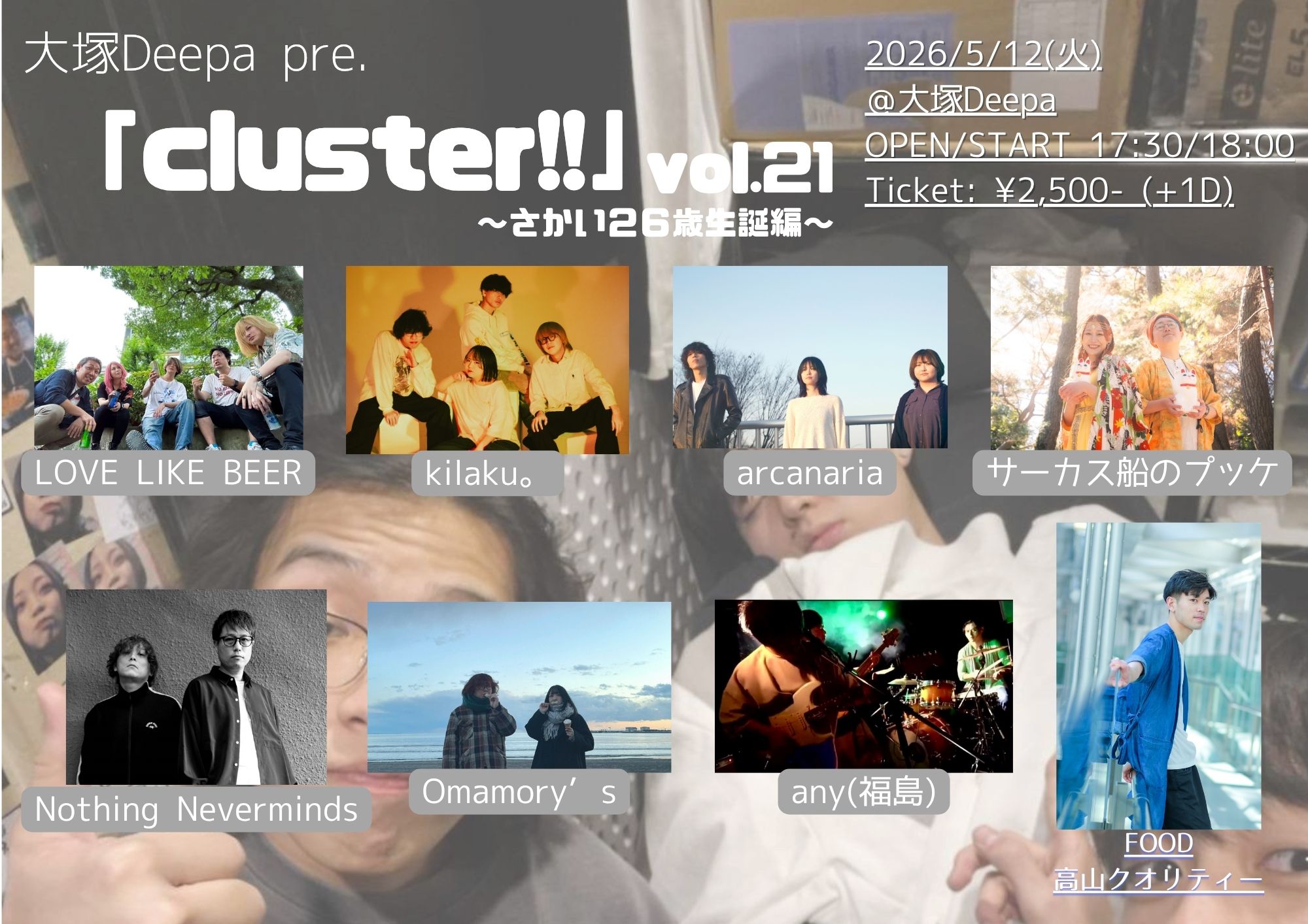 大塚 Deepa スケジュール 2026.5.12(Tue) 大塚Deepa pre. 「cluster!!」vol.21 さかい26歳生誕編 [ACT] LOVE LIKE BEER/kilaku。/arcanaria/サーカス船のプッケ/Nothing Neverminds/Omamory's/any(福島) [OPEN/START] 17:30/18:00 [料金] ADV/DOOR ¥2,500/¥2,500 (各別1D)