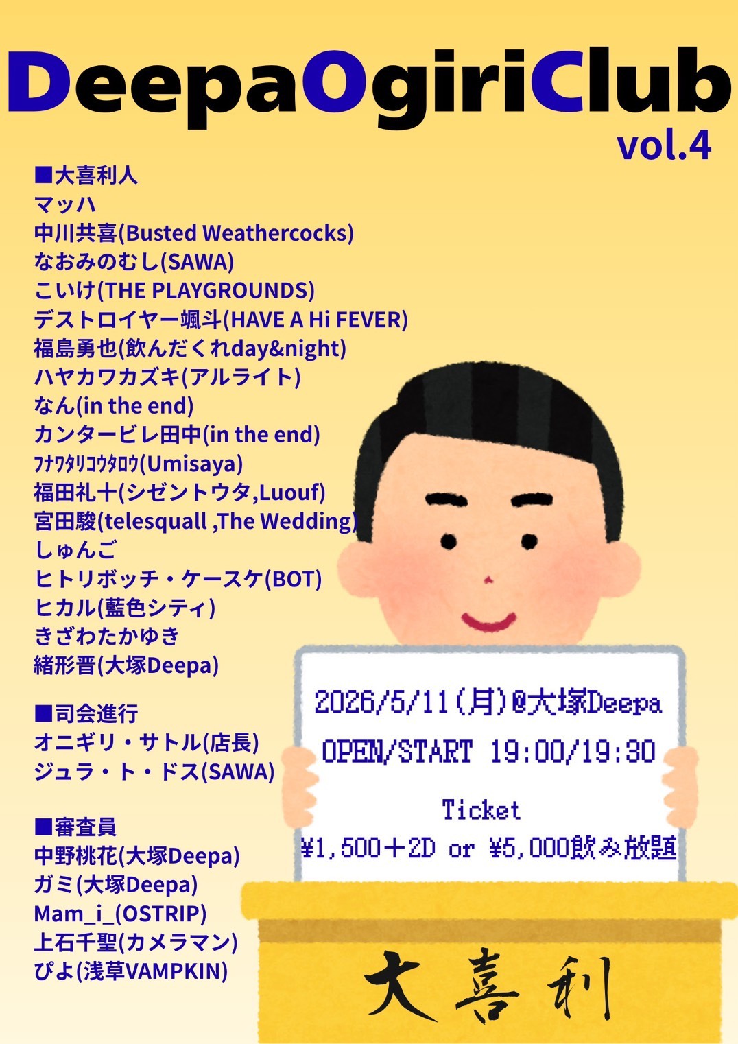 - 《決定大喜利人》 ・マッハ ・福島勇也(飲んだくれday&night) ・ヒトリボッチ・ケースケ(BOT) ・中川共喜(Busted Weathercocks) ・ハヤカワカズキ(アルライト) ・こいけ(THE PLAYGROUNDS) ・宮田駿(telesquall,The Wedding) ・デストロイヤー颯斗(HAVE A Hi FEVER) ・なおみのむし(SAWA) ・カンタービレ田中(in the end) ・フナワタリコウタロウ(Umisaya) ・なん(in the end) ・福田礼十(シゼントウタ,Luouf) ・しゅんご ・ヒカル(藍色シティ) ・きざわたかゆき ・緒形晋(大塚Deepa) 《司会進行》 オニギリ・サトル(店長) ジュラ・ト・ドス(SAWA) 《審査員》 中野桃花(大塚Deepa) ガミ(大塚Deepa) Mam_i_(OSTRIP) 上石千聖(カメラマン) ぴよ(浅草VAMPKIN)