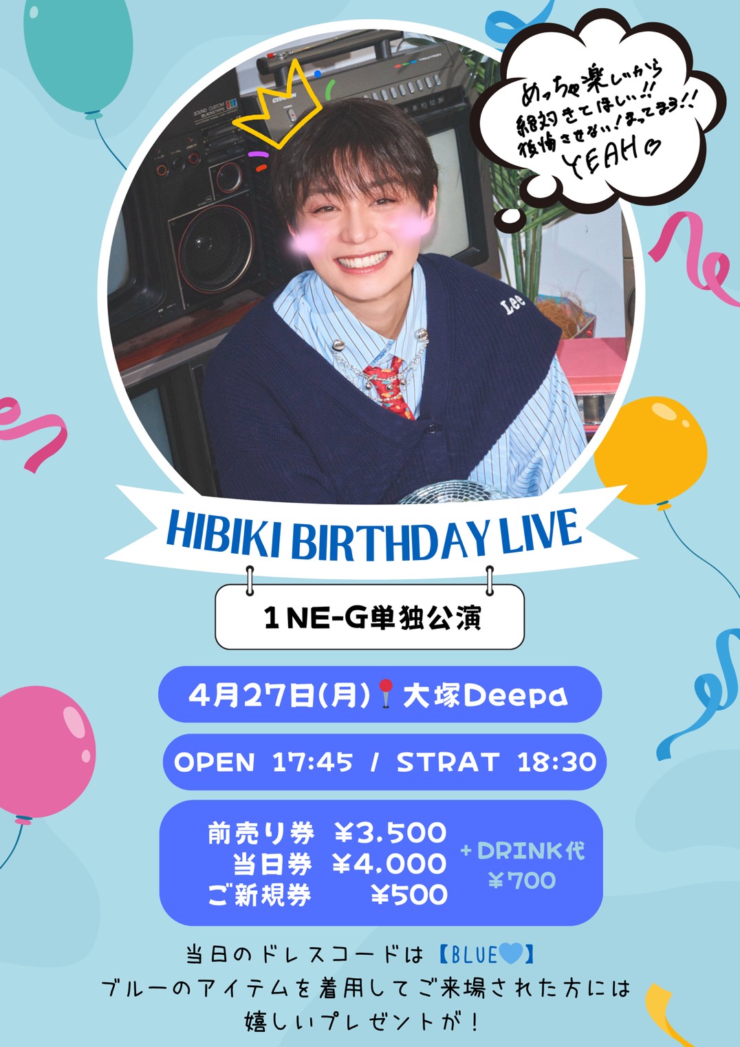 大塚 Deepa スケジュール 2026.4.27(Mon) 1NE-G単独公演「HIBIKI BIRTHDAY LIVE」 [ACT] 1NE-G [OPEN/START] 17:45/18:30 [料金] 前売 ¥3,500/当日¥4,000 ご新規さん ¥500 (+Drink代)