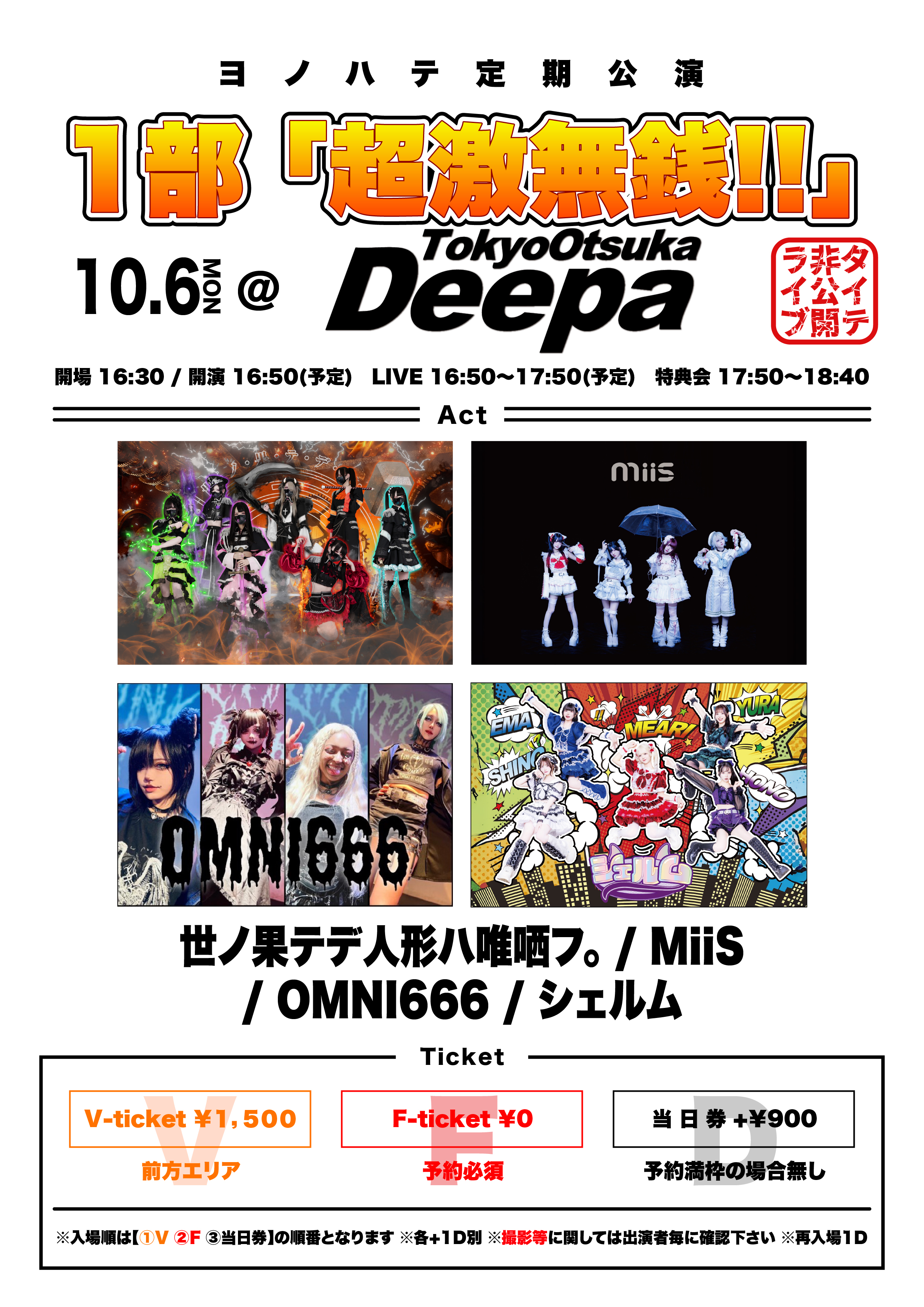 - Fチケット0円(予約必須)(後方エリア) Vチケット1,500円(前方エリア) 当日+900円(満枠の場合無し) 各+1D別途必要となります。