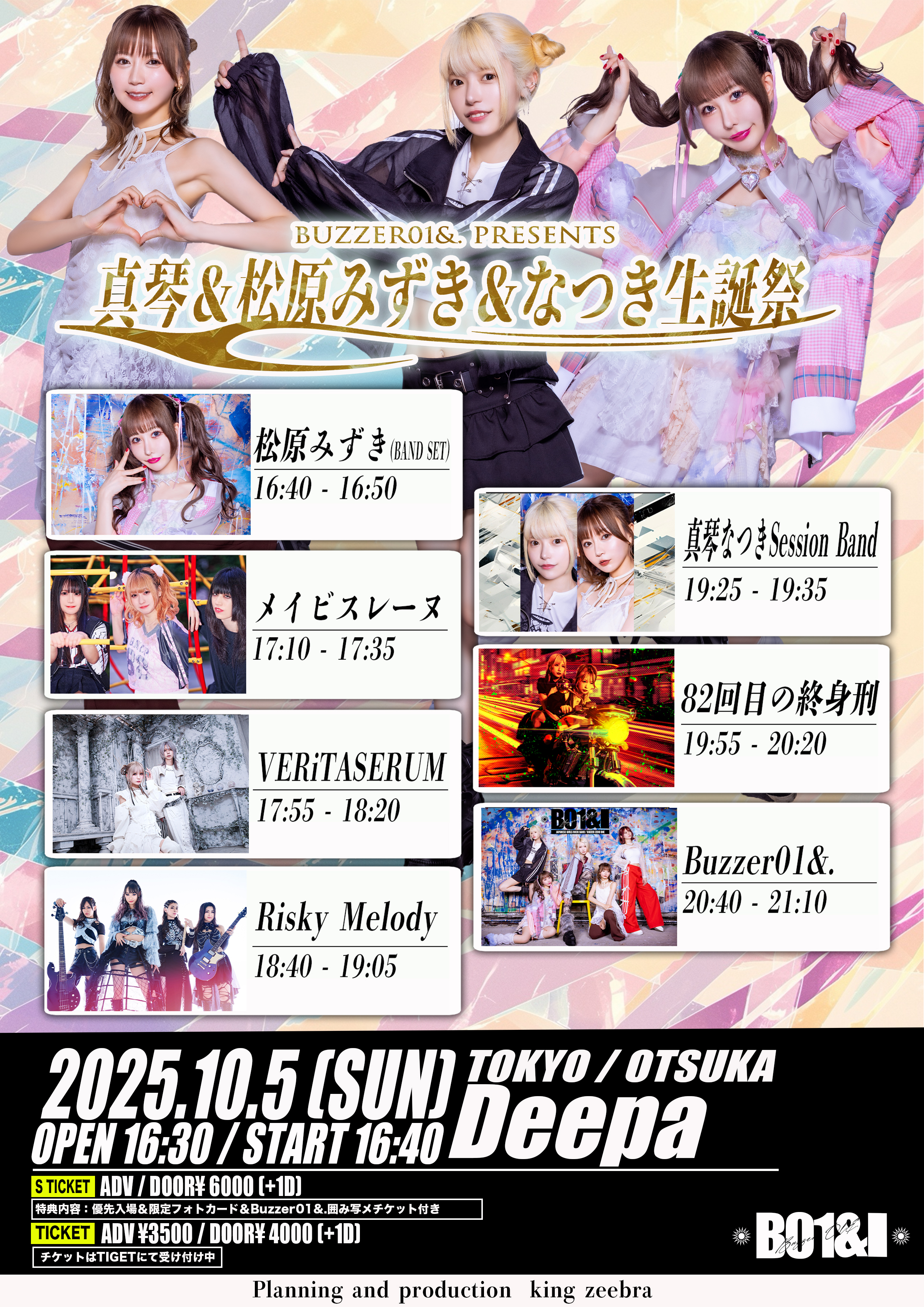 - 【CAST】 ・Buzzer01&. ・82回目の終身刑 ・Risky Melody ・VERiTASERUM ・メイビスレーヌ 【OPENING GUEST】 ・真琴なつきSession Band ( VoBa.真琴 / VoGt.なつき / Dr.ちゃんちー ) ・松原みずき(BAND SET)