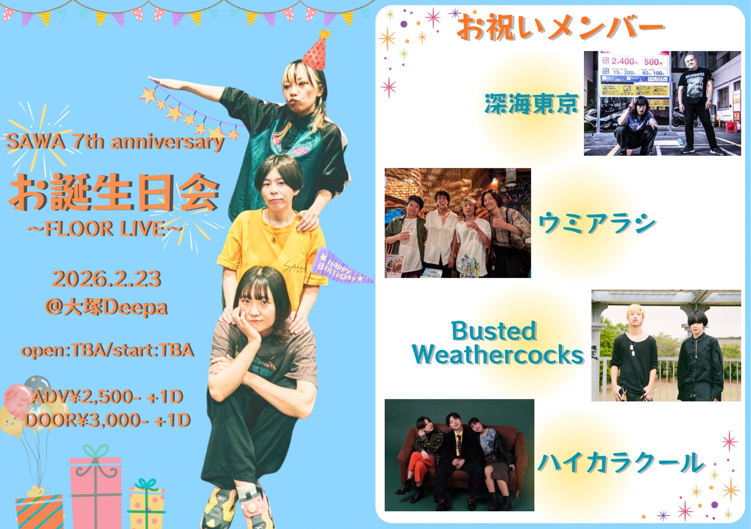 大塚 Deepa スケジュール 2026.2.23(Mon) SAWA7th anniversary『お誕生日会』 [ACT] SAWA / Busted Weathercocks / ウミアラシ / ハイカラクール [OPEN/START] TBA/TBA [料金] ADV/DOOR ¥2,500/¥3,000 (各別1D)