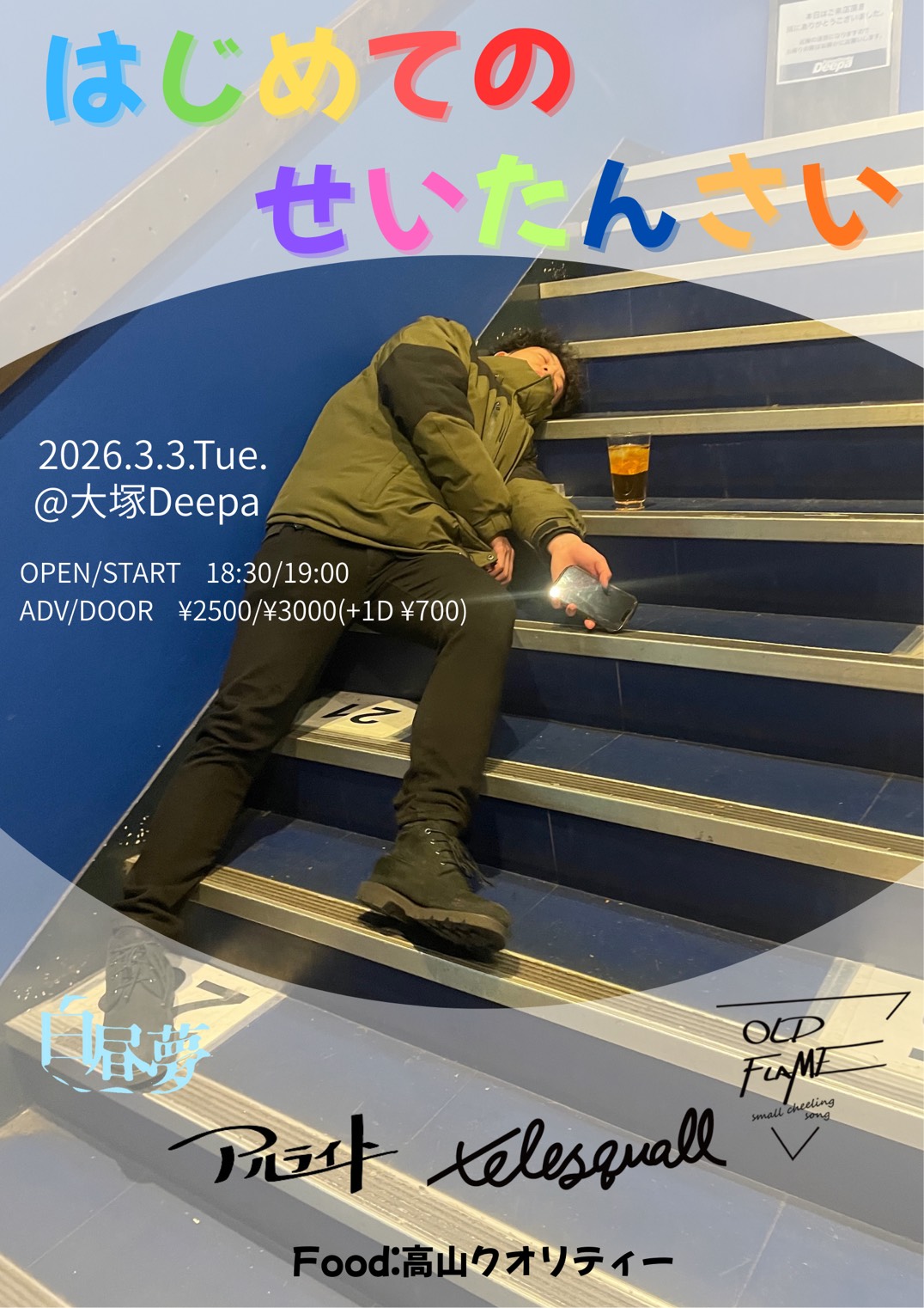 大塚 Deepa スケジュール 2026.3.03(Tue) 阿部 シュン、「はじめてのせいたんさい」 [ACT] アルライト/白昼夢/oldflame/telesquall FOOD:高山クオリティー [OPEN/START] 18:30/19:00 [料金] ADV/DOOR ¥2,500/¥3,000 (各別1D)