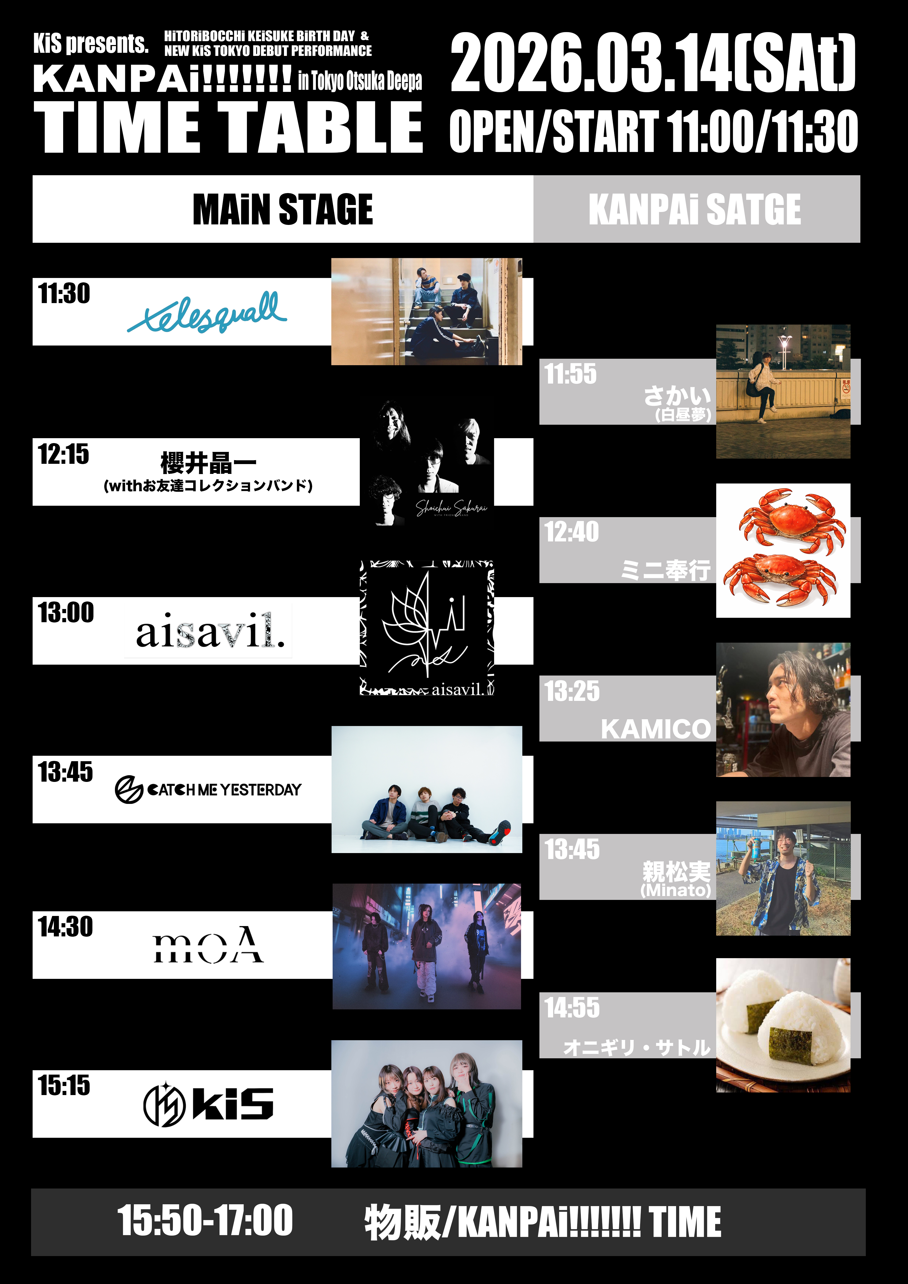 - [MAiN STAGE] KiS/aisavil./CATCH ME YESTERDAY/telesquall/櫻井晶一(withお友達コレクションバンド)/moA [KANPAi STAGE] オニギリ・サトル/KAMICO/ミニ 奉行/さかい(白昼夢)/親松実(Minato)