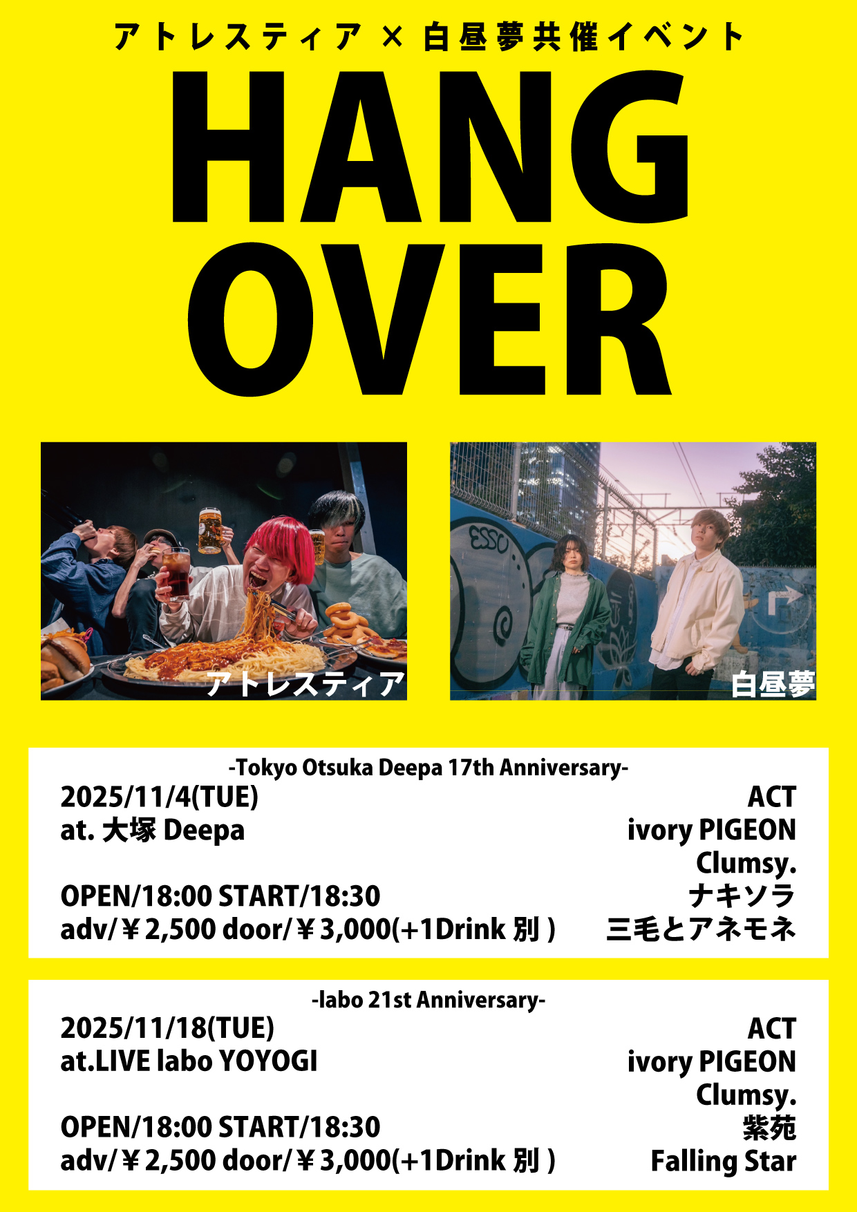 大塚 Deepa スケジュール 2025.11.04(Tue) アトレスティア×白昼夢共催イベント 「HANG OVER」 [ACT] 白昼夢 / アトレスティア / ivory PIGEON / Clumsy. / 三毛とアネモネ / ナキソラ [OPEN/START] 18:00/18:30 [料金] ADV/DOOR ¥2,500/¥3,000 (各別1D)