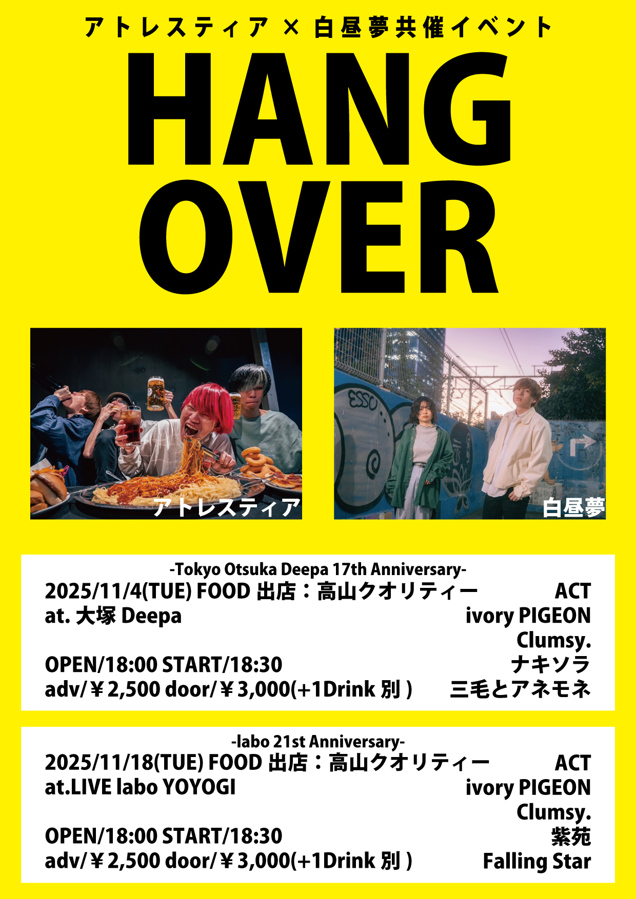 大塚 Deepa スケジュール 2025.11.04(Tue) アトレスティア×白昼夢共催イベント 「HANG OVER」 [ACT] 白昼夢 / アトレスティア / ivory PIGEON / Clumsy. / 三毛とアネモネ / ナキソラ FOOD:高山クオリティ [OPEN/START] 18:00/18:30 [料金] ADV/DOOR ¥2,500/¥3,000 (各別1D)