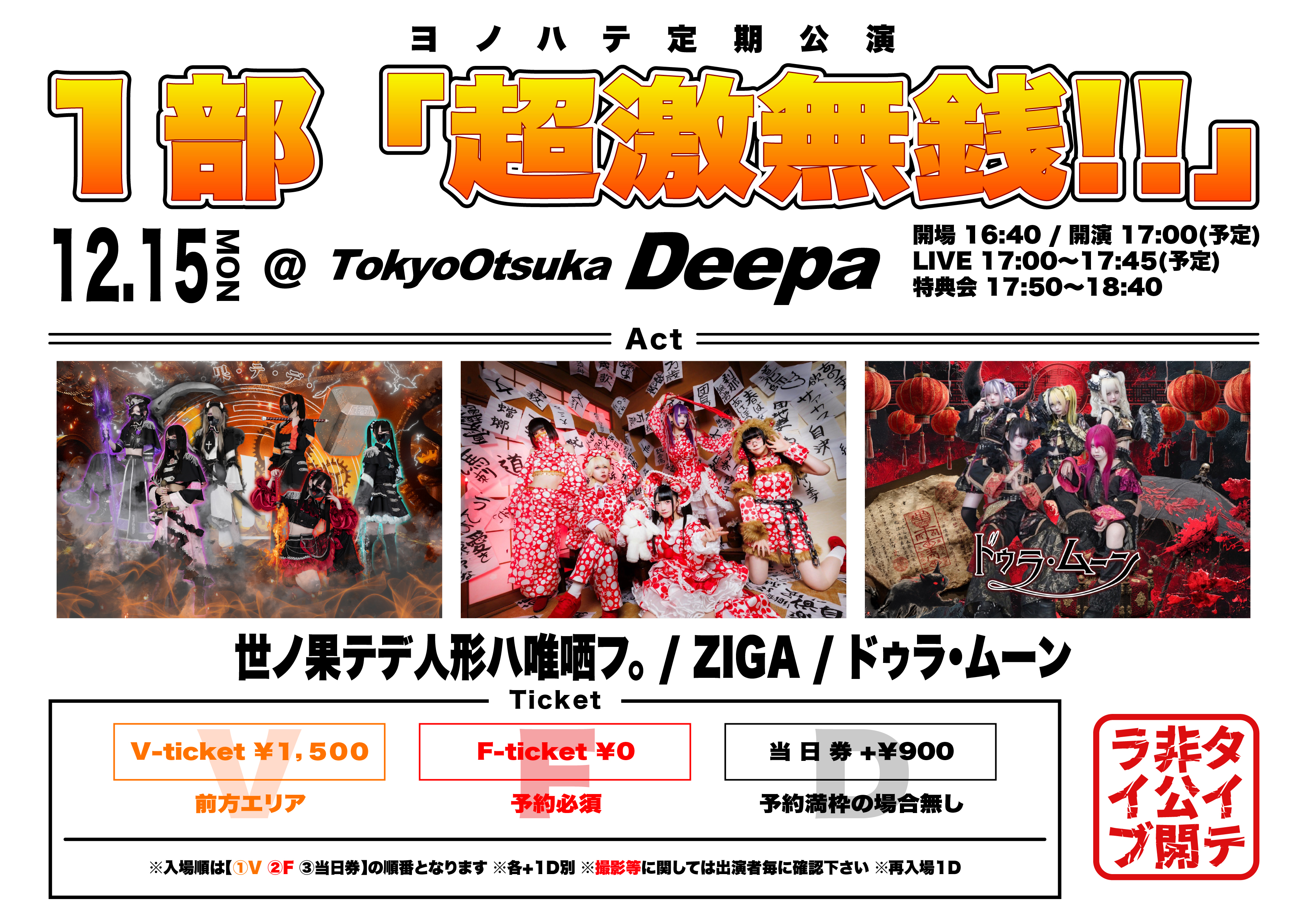 - Fチケット0円(予約必須)(後方エリア) Vチケット1,500円(前方エリア) 当日+900円(満枠の場合無し) 各+1D別途必要となります。