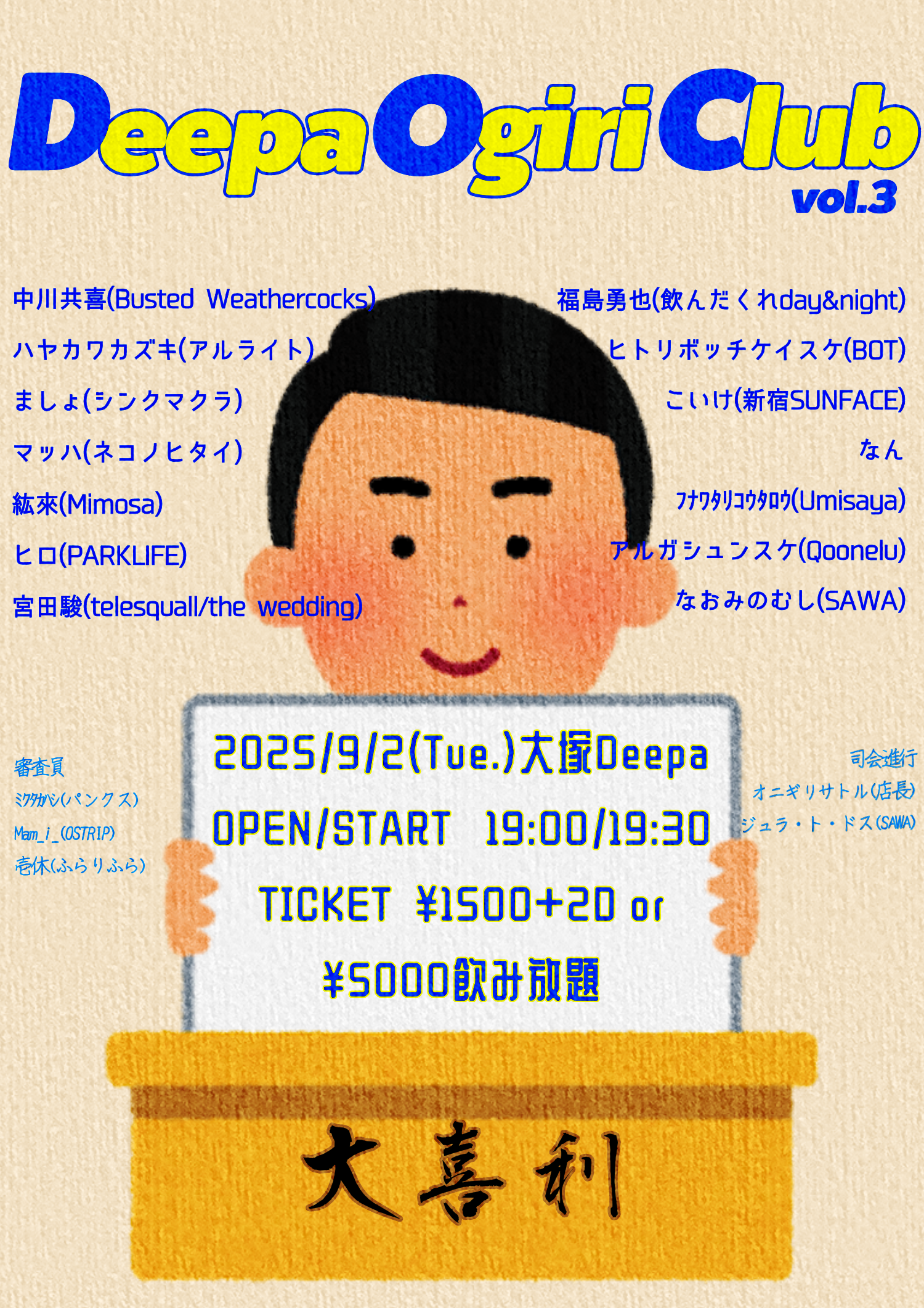 大塚 Deepa スケジュール 2025.9.02(Tue) DOC vol.3 [ACT] 出演者多数、フライヤー参照 [OPEN/START] 19:00/19:30 [料金] TICKET ¥1500+2D or ¥5000(FreeDrink)