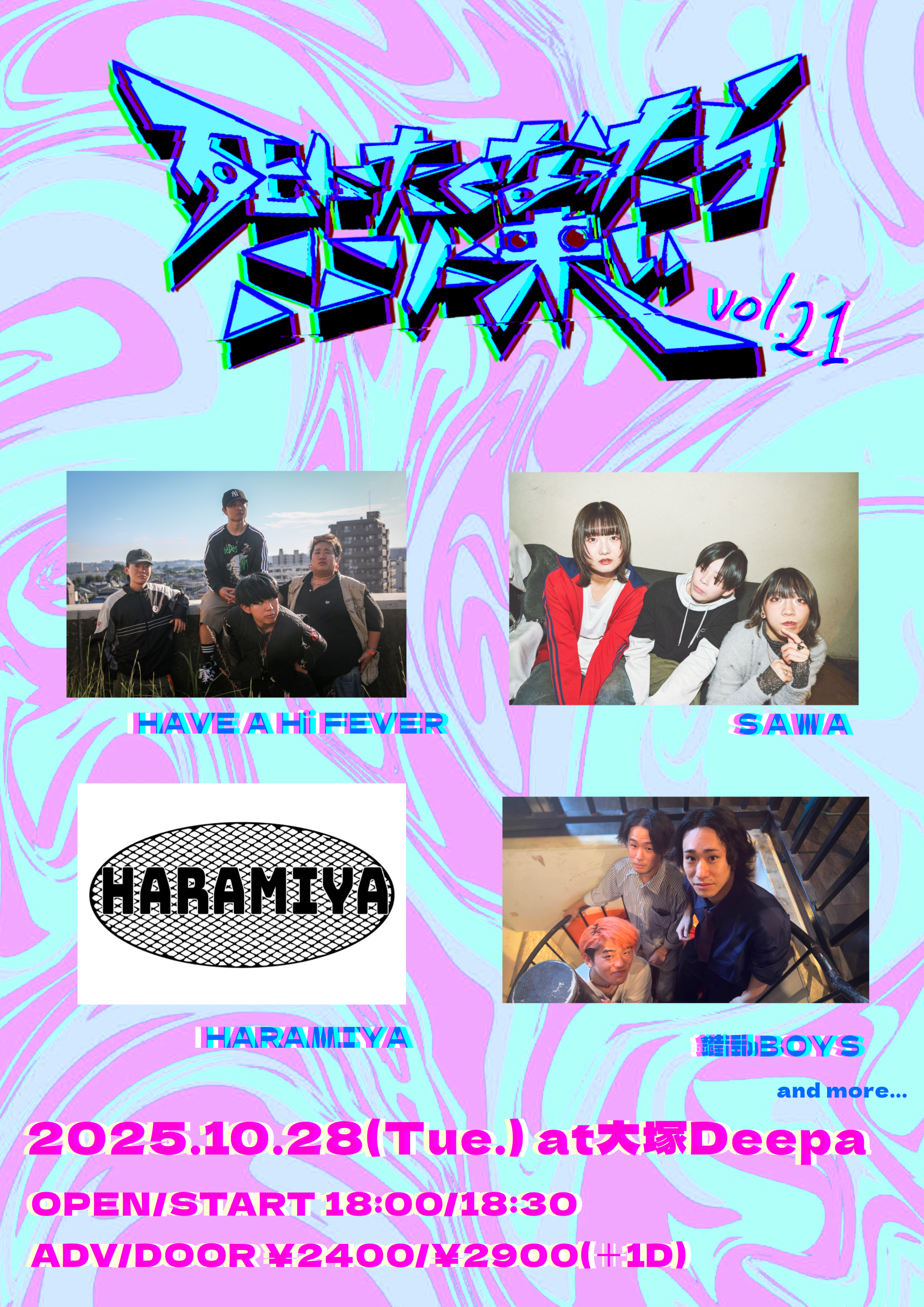 大塚 Deepa スケジュール 2025.10.28(Tue) 死にたくなったらここに来いvol.21 [ACT] HAVE A Hi FEVER / HARAMIYA / 錯乱BOYS / SAWA and more... [OPEN/START] 18:00/18:30 [料金] ADV/DOOR ¥2,400/¥2,900 (各別1D)