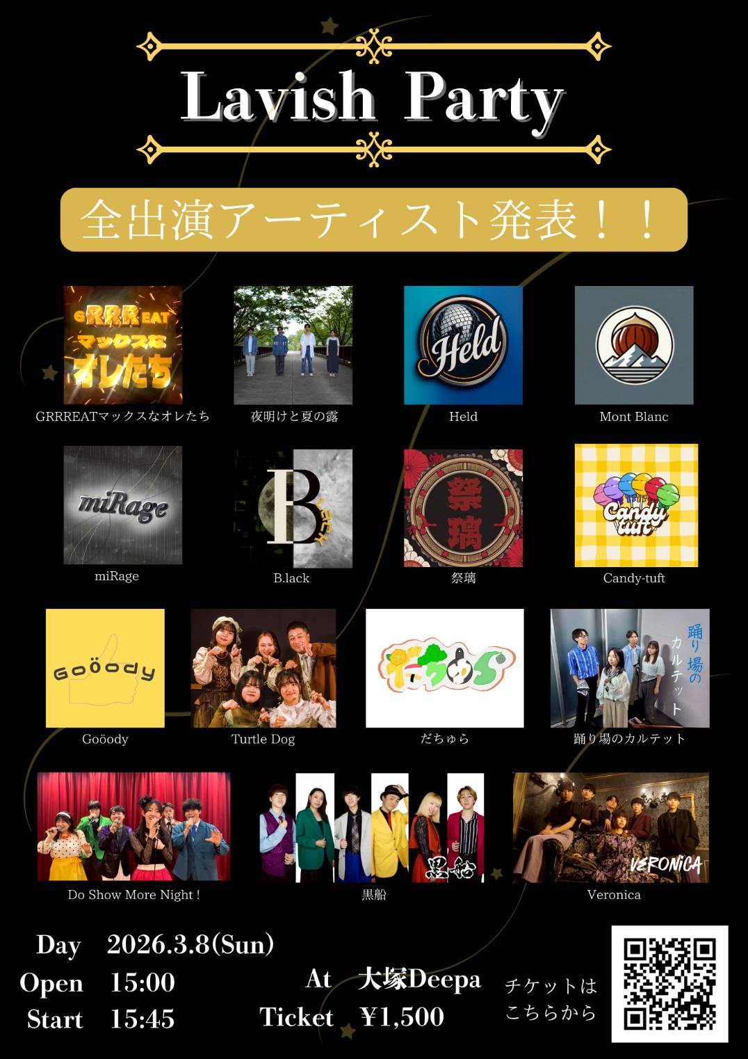 大塚 Deepa スケジュール 2026.3.08(Sun) Lavish Party [OPEN/START] 15:00/15:45 [料金] ADV/DOOR ¥1,500/¥1,500 (各別1D) ・オールスタンディングです ・途中入場、途中退場OK(再入場は1drink charge¥700-頂戴しております) ・ペンライトやうちわ等の応援グッズ持ち込み推奨!
