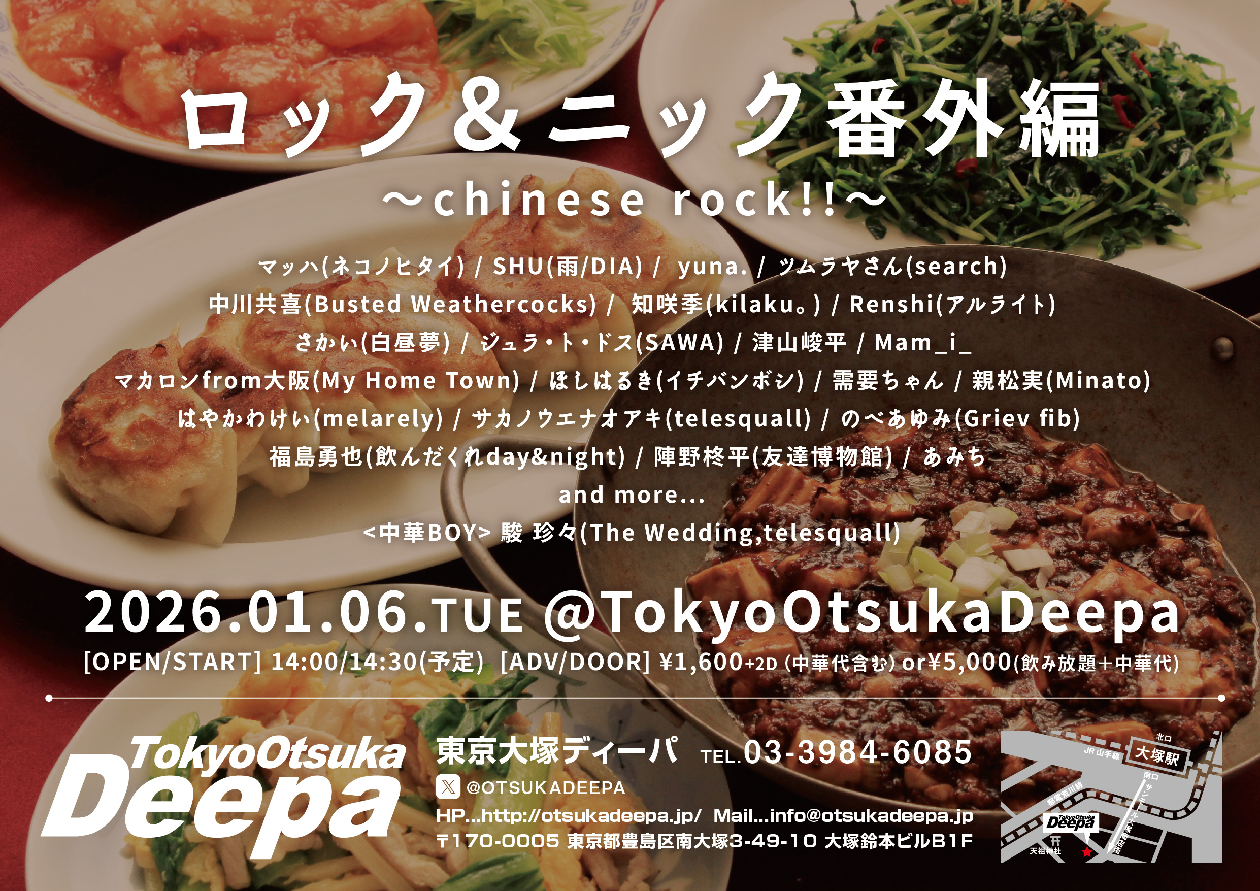 - ADV/DOOR ¥1,600(+2D¥1,400-)中華代含むor¥5,000-(飲み放題+中華代)