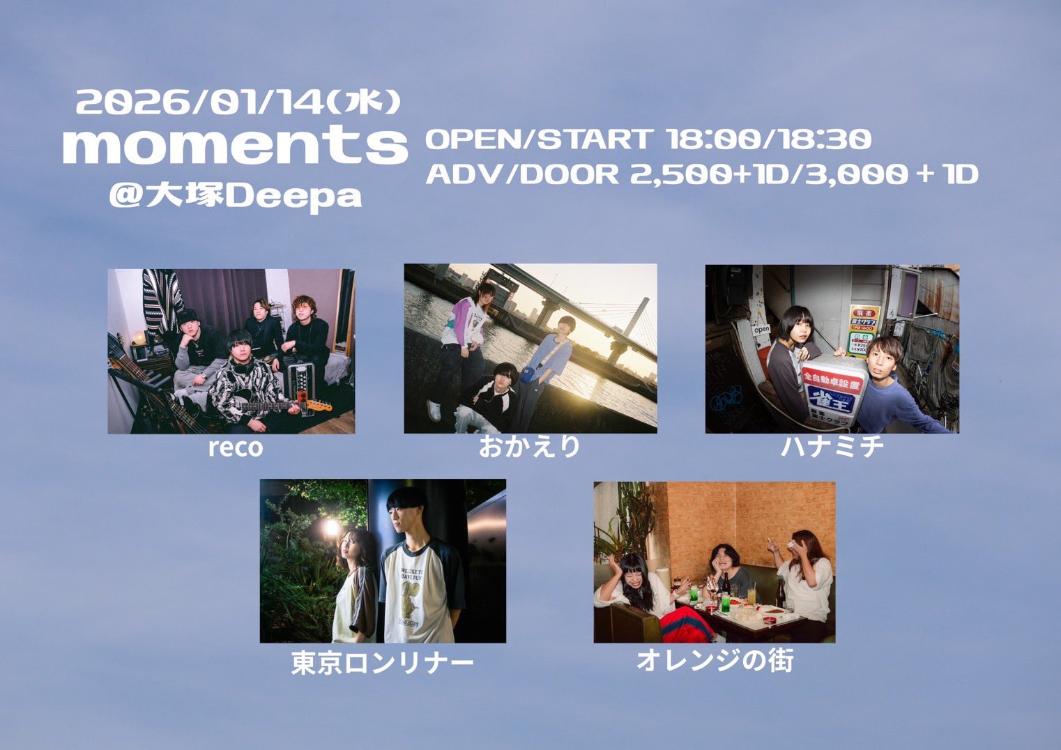 大塚 Deepa スケジュール 2026.1.14(Wed) moments 3週連続企画 [ACT] おかえり / オレンジの街 / reco / 東京ロンリナー / ハナミチ [OPEN/START] 18:00/18:30 [料金] ADV/DOOR ¥2,500/¥3,000 (各別1D)
