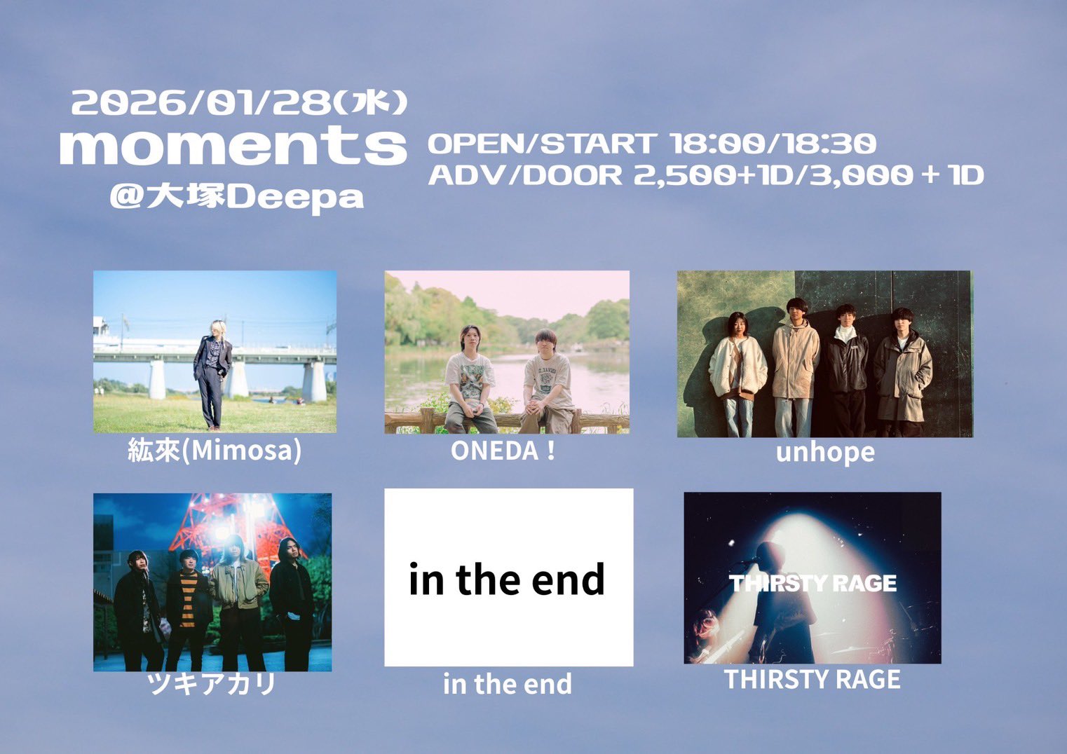 大塚 Deepa スケジュール 2026.1.28(Wed) moments 3週連続企画 [ACT] ONEDA! / 紘來(Mimosa) / ツキアカリ / in the end / unhope / THIRSTY RAGE [OPEN/START] 18:00/18:30 [料金] ADV/DOOR ¥2,500/¥3,000 (各別1D)