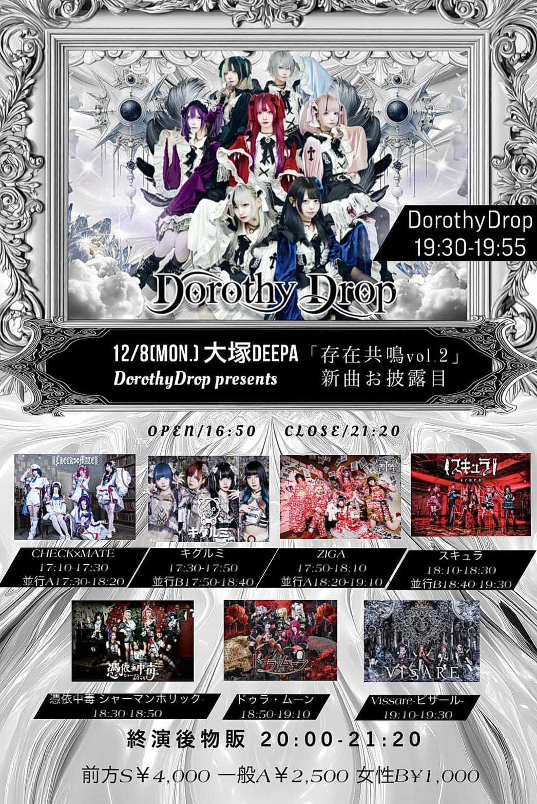 大塚 Deepa スケジュール 2025.12.08(Mon) DorothyDrop新曲お披露目主催 『存在共鳴vol.2』 [ACT] DorothyDrop/ドゥラ・ムーン/憑依中毒-シャーマンホリック-/キグルミ/Vissare/ZIGA/CHECK×MATE/スキュラ [OPEN/START] 16:50/17:10 [料金] 前方S¥4,000 一般A¥2,500 女性B¥1,000 https://t.livepocket.jp/e/ne70d