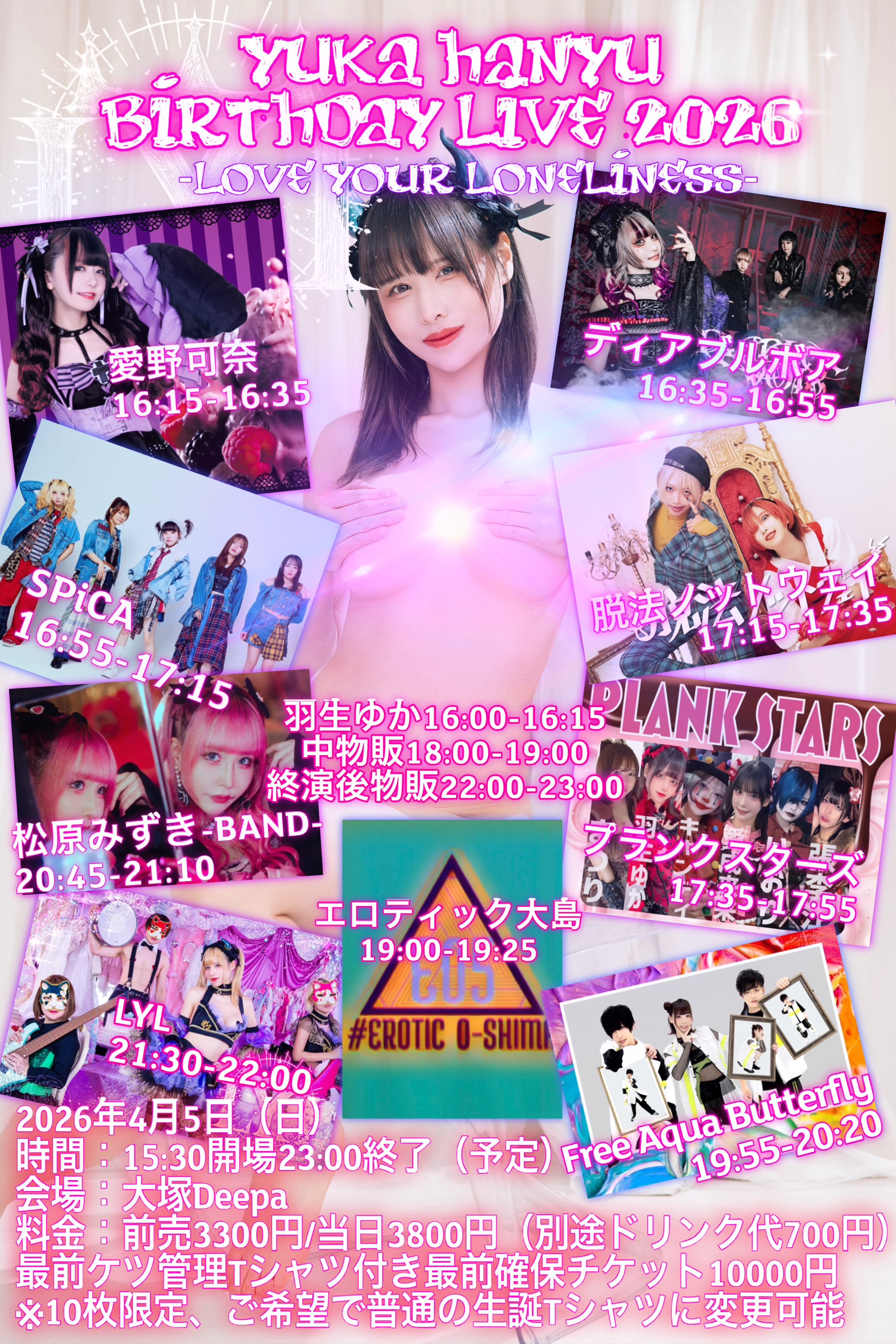 大塚 Deepa スケジュール 2026.4.05(Sun) 羽生ゆか生誕ライブ2026-LOVE YOUR LONELINESS- [ACT] 羽生ゆか / LYL / ディアブルボア / FreeAquaButterfly / 松原みずき / 愛野可奈 / プランクスターズ / 脱法ノットウェイ / エロティック大島 / 大島はるな / SPiCA [OPEN/START] 15:30/16:00 [料金] 前売3300円/当日3800円(別途ドリンク代700円)