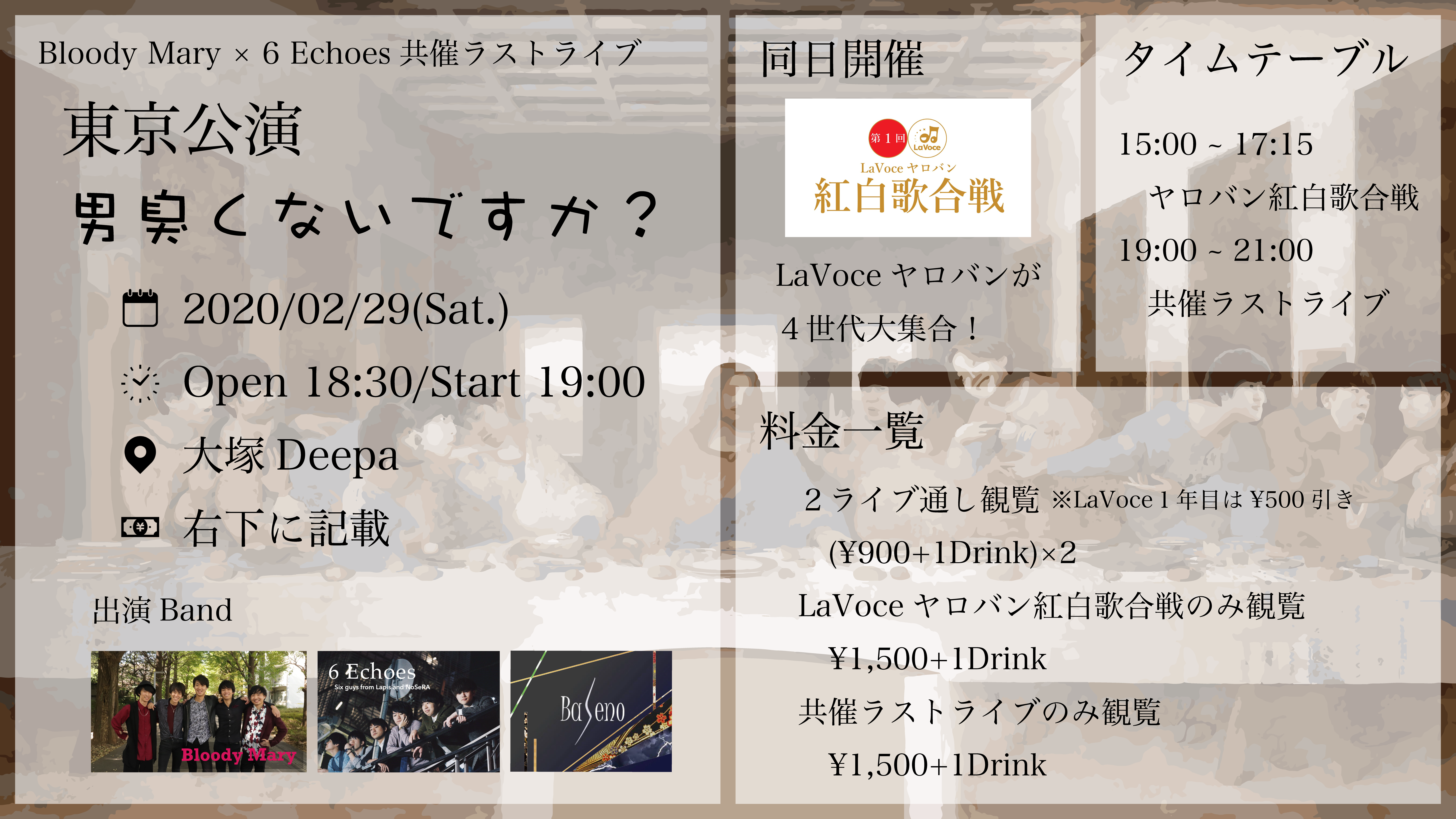 大塚 Deepa スケジュール 2020.2.29(Sat) 第1回LaVoceヤロバン紅白歌合戦 [ACT] Carbon Foot Print、Mingles、Bloody Mary、Blue Bull、とこしえ、Amethyst、SIMo Free、gonna be…、Tempest、OLoody Mary、Blacky Mary [OPEN/START] 14:45/15:00 [料金] ADV/DOOR ¥1,500/¥1,500 (1Drink代金¥600別途必要)(※共催ラストライブとのセット割引で¥900 + 1Drink) (問)bloodymary.lavoce@gmail.com