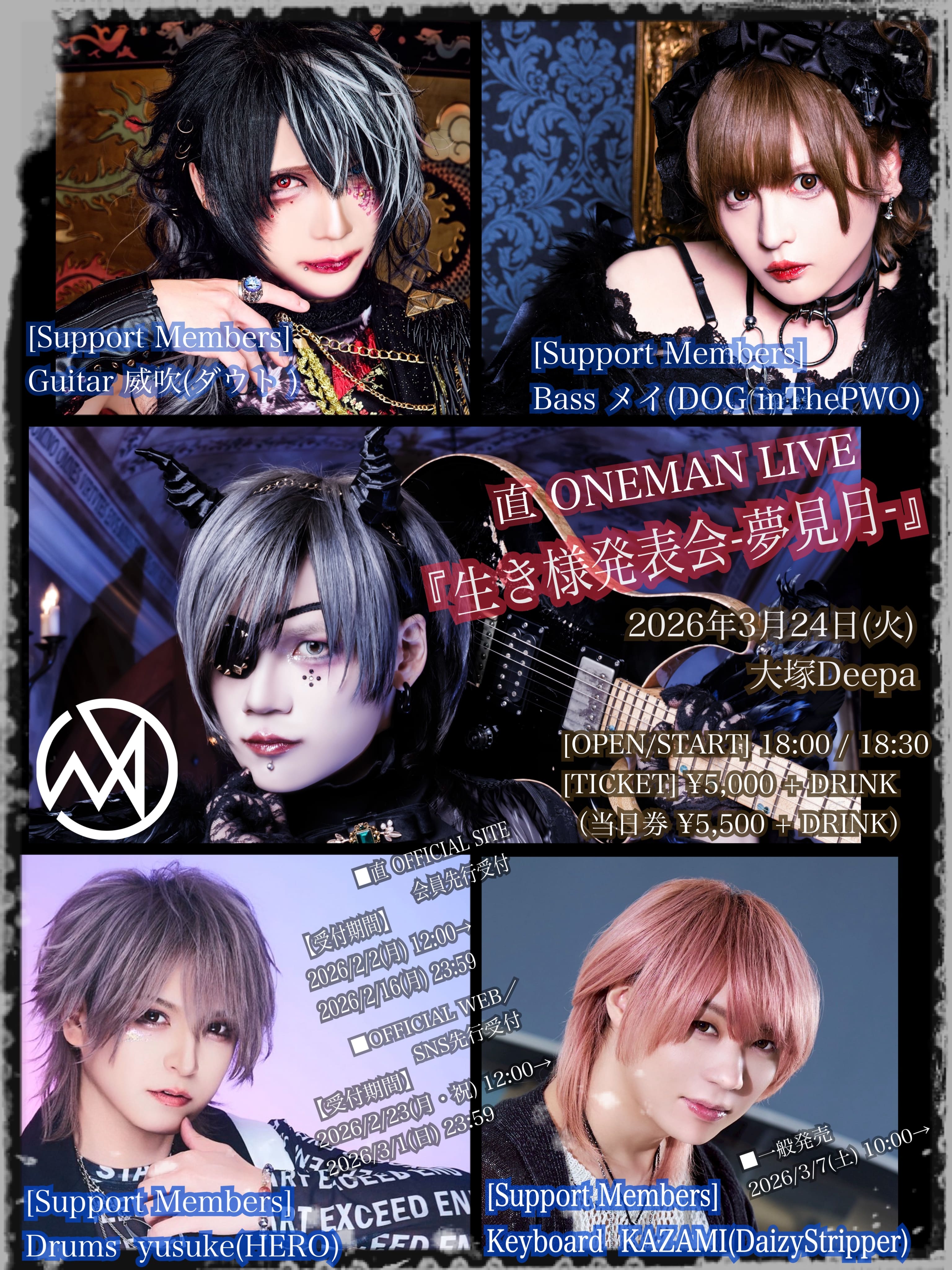 大塚 Deepa スケジュール 2026.3.24(Tue) 直 ONEMAN LIVE 『生き様発表会-夢見月-』 [ACT] 直 [Support Members] Guitar 威吹(ダウト ) Bass メイ(DOG inThePWO) Keyboard KAZAMI(DaizyStripper) Drums yusuke(HERO) [OPEN/START] 18:00/18:30 [料金] [TICKET] ¥5,000 + DRINK(当日券 ¥5,500 + DRINK)