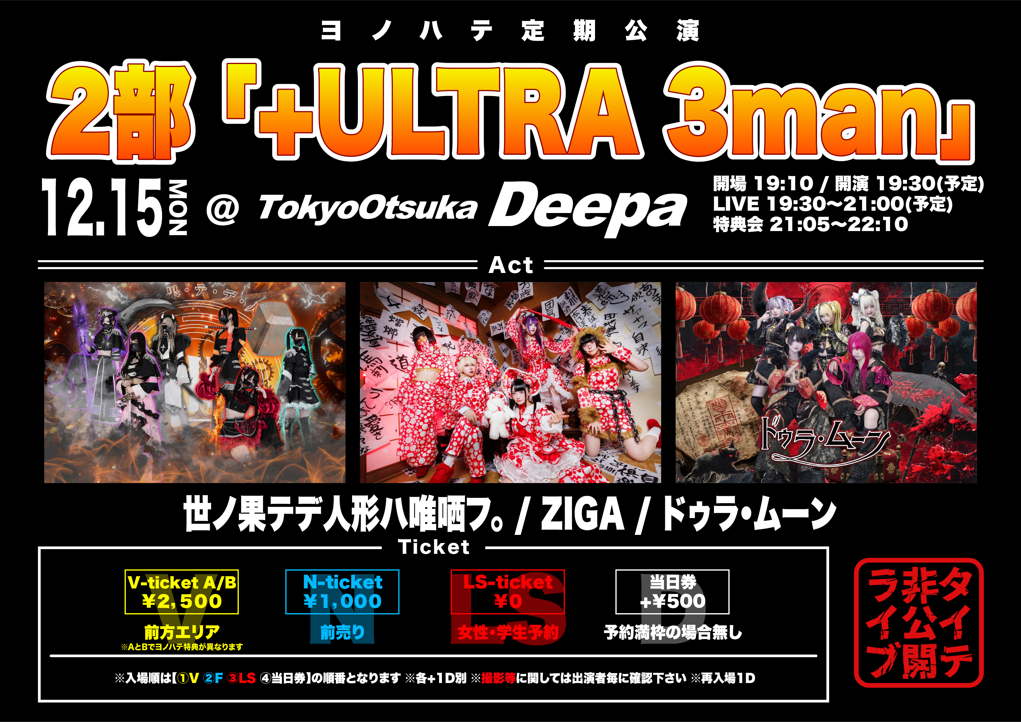※当イベントへ出演を予定しているいずれかのユニットにて出禁措置対象となっている方はご入場できません(前売りチケットをご購入された場合は返金等は致しかねますのでご購入はご遠慮下さい)