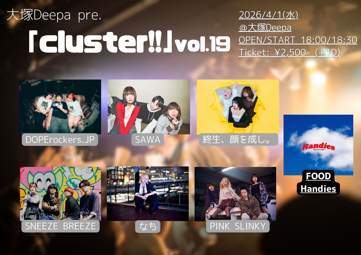 大塚 Deepa スケジュール 2026.4.01(Wed) 大塚Deepa pre.「cluster!!」vol.19 [ACT] DOPErockers.JP/SAWA/終生、顔を成し。/SNEEZE BREEZE/なち/PINK SLINKY <FOOD> handies [OPEN/START] 18:00/18:30 [料金] ¥2,500(1drink charge ¥700-別途)