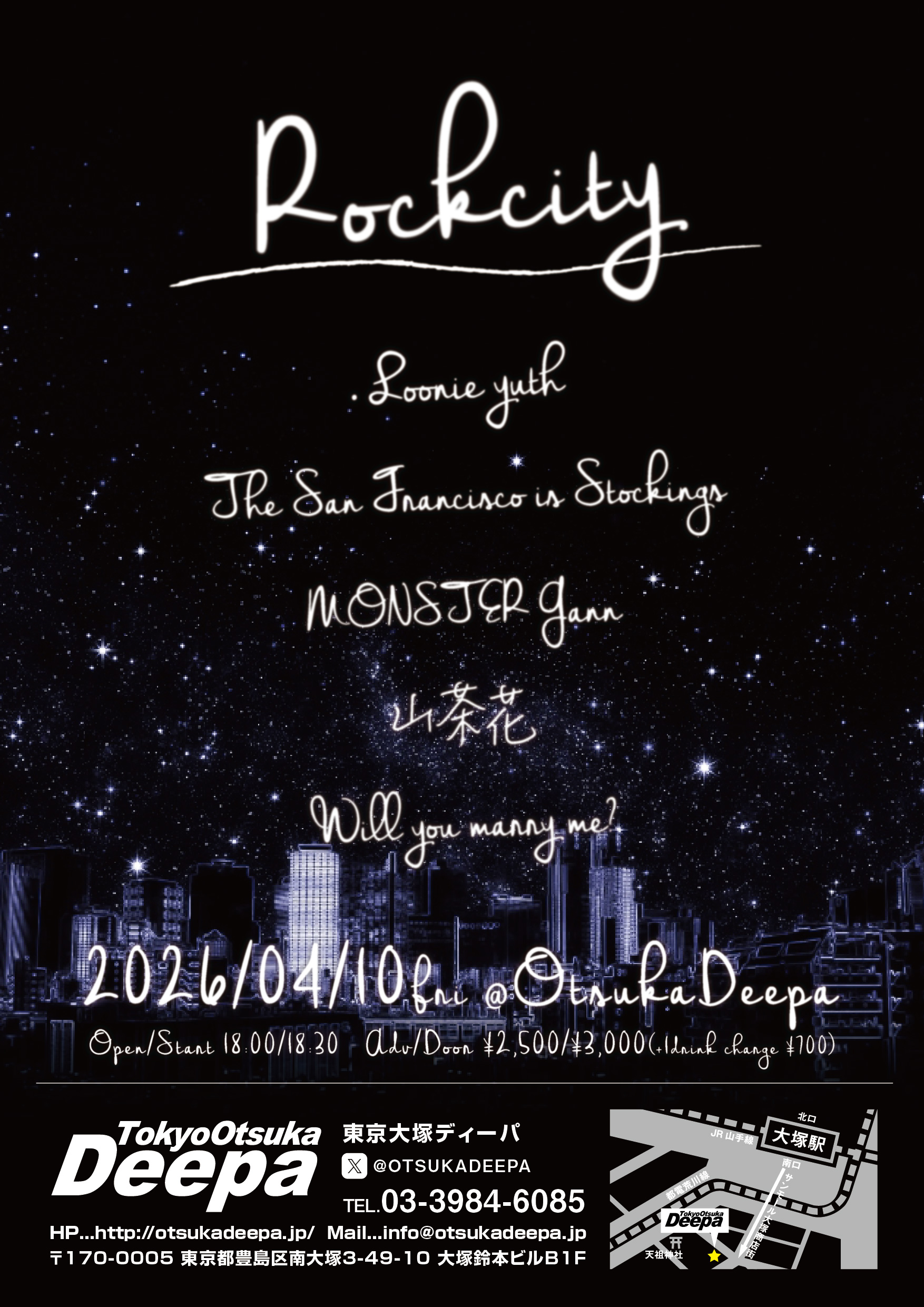 大塚 Deepa スケジュール 2026.4.10(Fri) Rockcity [ACT] .Loonie yuth / The San Francisco is Stockings / MONSTER Gann / 山茶花 / Will you marry me? [OPEN/START] 18:00/18:30 [料金] ADV/DOOR ¥2,500/¥3,000 (各別1D)